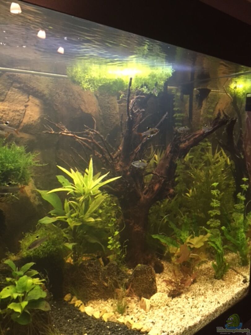 "Steinmauer" von Juwel, Wurzeln die den linken und rechten Teil von meinen Aquarium trennt. Im rechten Teil vom Aquarium befindet sich eine Wurzel und im linken Teil eine Mangrovenwurzen bzw zwei, die eine Art baum mit wurzel unten darstellen soll. Auf der Wurzel habe ich mit Nylonfaden Anubias und Moose fixiert.