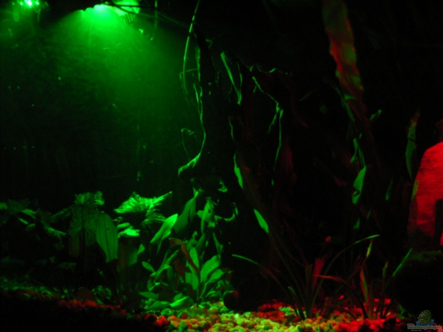 1 Keramikhöhle 3 Mangrovenwurzeln Marina Nachtlichtdioden: 2xgrün 1xrot siehe Nachtaufnahmen welche mit 8sec Langzeitbelichtung gemacht wurden. Im ??brigen stört das Diodenlicht meine Fische überhaupt nicht. Sie schlafen sogar direkt am Spot. 3-5 Seemandelbaumblätter werden alle 4 Wochen ausgetauscht.