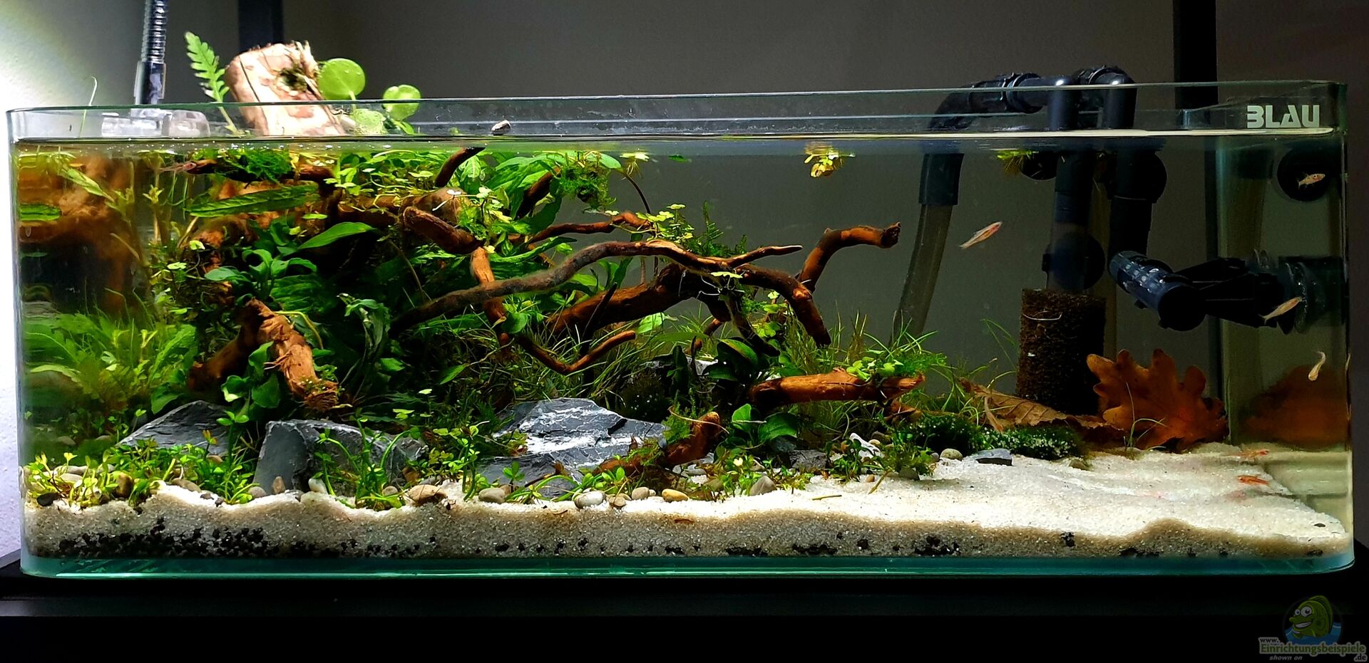 Besonders flaches Rechteck-Aquarium mit 17 Liter Inhalt und abgerundeten Ecken an der Frontscheibe. Hergestellt aus besonders hochwertigem Floatglas(Hersteller Blau Aquaristic) Erstes Aquascape/Naturaquarium, das einen seichten Nebenfluss darstellen soll bei dem Wurzeln hineinragen und eine dichte Randbepflanzung aufweisst und durch die Bepflanzung und Schwimmpflanzen teilweise beschattet wird.
