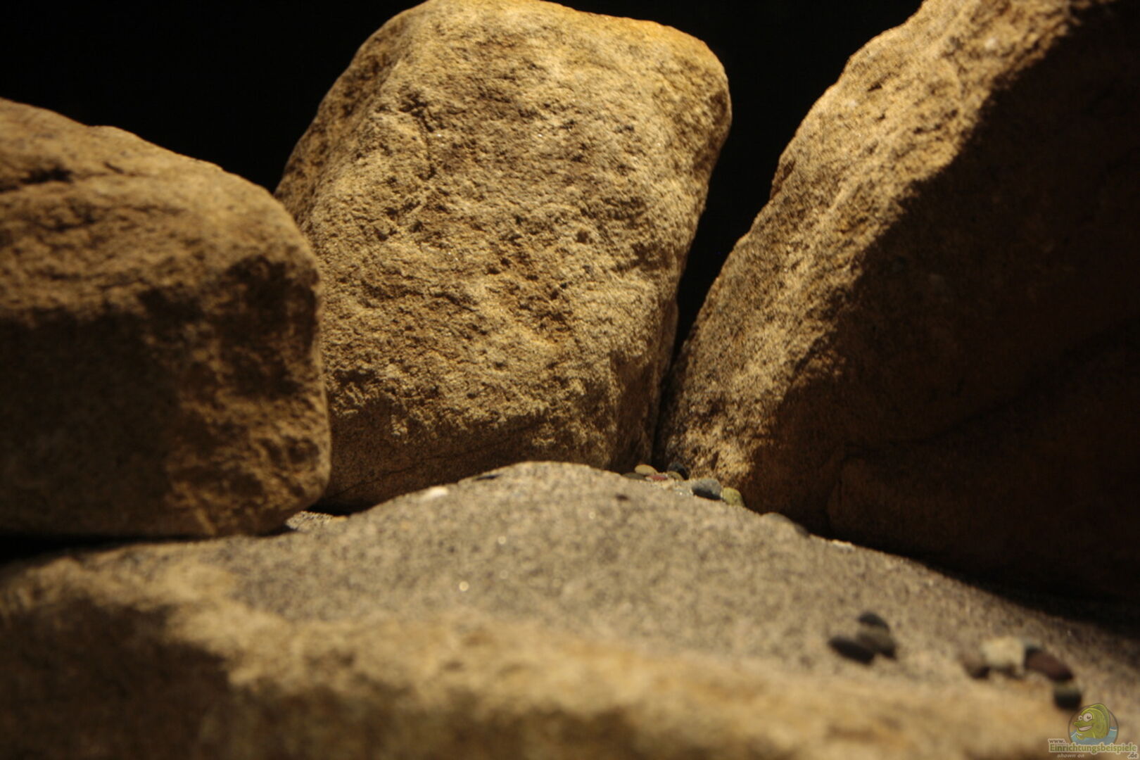 Füe die Dekoration sind ca 120-150kg echte Steine (Ruhrsandstein) zum Einsatz gekommen, welche teilweise (au??en) bis an die Wasseroberfläche reichen, um Georgina die Möglichkeit zu geben auch mal an "Land" gehen zu können. Das ganze soll eine seichte Felszone mit ausreichend Spalten und "Höhlen" suggerieren, damit Georgina sich auch bei belieben "unsichtbar" machen kann. Bei der Einrichtung wurde darauf geachtet, diese "naturnah" zu gestalten. [...]