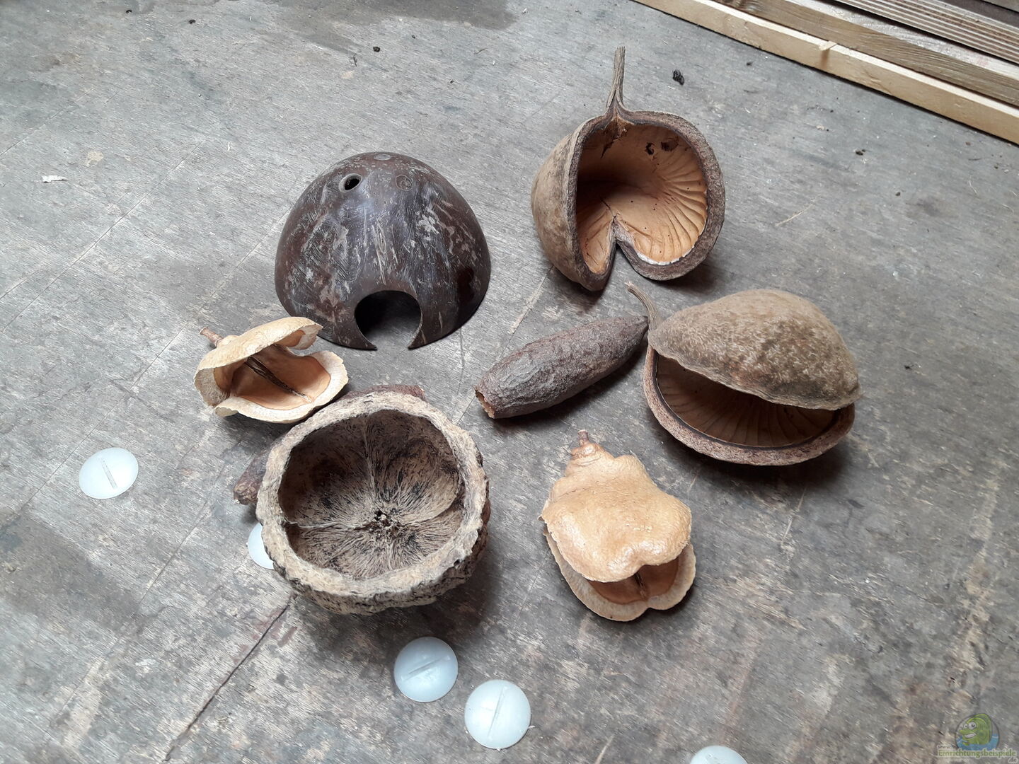 -einige unterschiedlich gro??e Stücke Mangrovenholz -Tonröhren für die Welse -Kokosnussschalenhälften für die Apistogramma -Schwarzerlenzapfen -Walnussblätter -Als Versuch habe ich bei der Panta Rhei GmbH Jacetiba Hornkapseln und eine Paranussschale bestellt. Sollten sie angenommen werden und einiger ma??en halten, wird nachbestellt. -2 halbierte Froschmaul Schoten