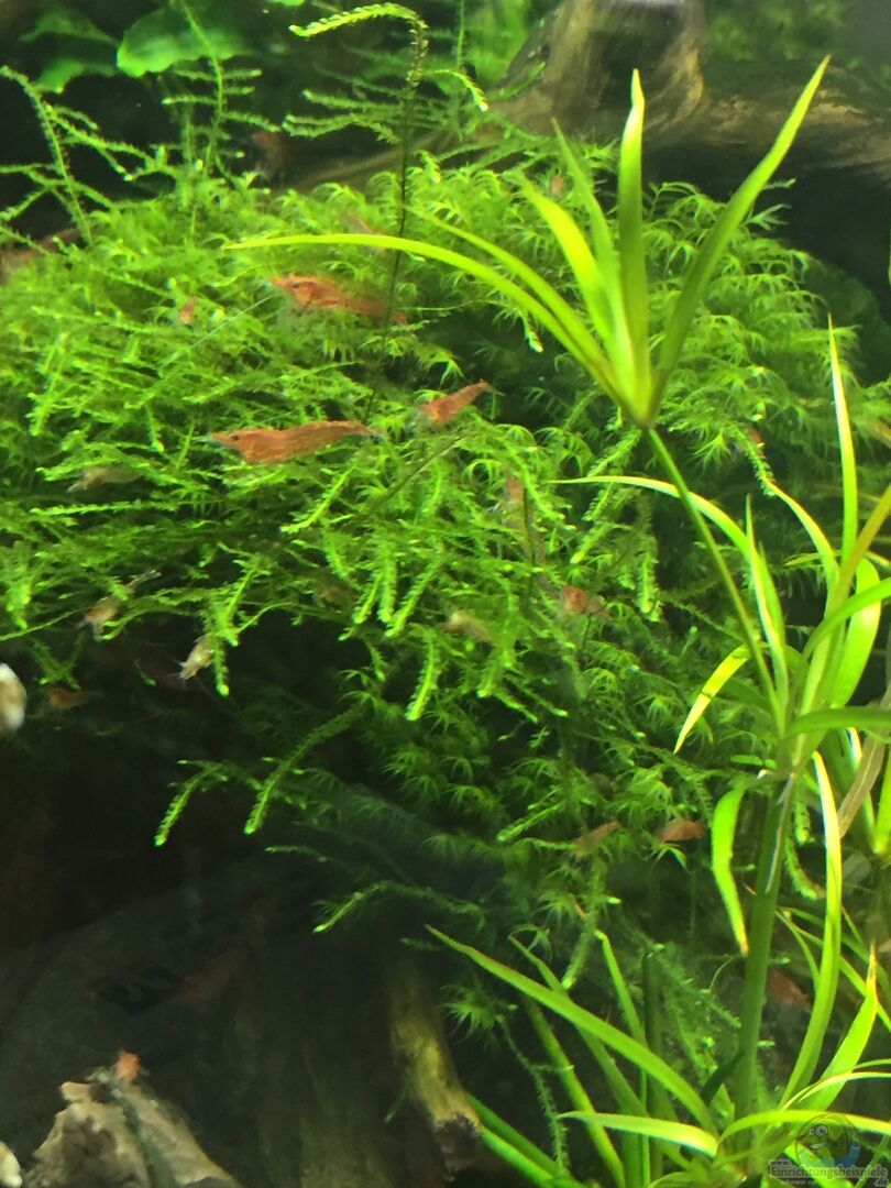 Der Besatz besteht aus mittlerweile 300+ Neocaridina heteropoda var. Red (Red-Fire-Garnelen). Trotz der Vielzahl an Garnelen wirkt das Becken nicht wirklich voll. Die Red-Fire-Garnelen sind absolut anspruchslos und sehr zu empfehlen.