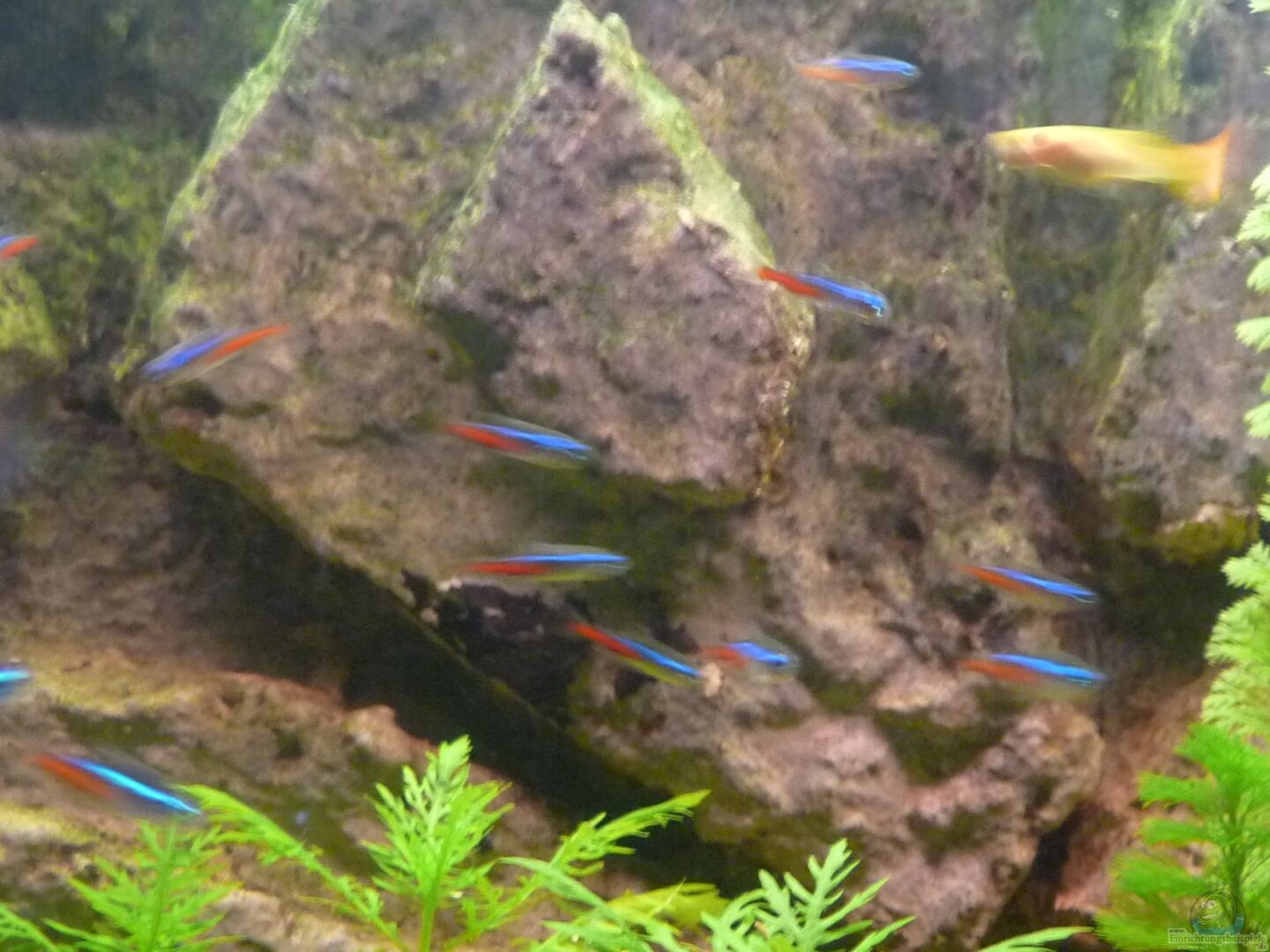 Momentan sind : 6 Guppys 1M/5W (Poecilia reticulata) 4 Schwertträger 1M/2 W und ein Baby (Xiphophorus helleri) 21Neonsalmler (Paracheirodon innesi) 4 Schwarze Neons (Hyphessobrycon herbertaxelrodi) 3 Orangeflossen Panzerwelse, werden noch aufgestockt (Corydoras sterbai) 2 Goldsalmer (übriggebliebene) 1 Kardinalfisch (übriggebliebender) (Tanichthys albonubes)