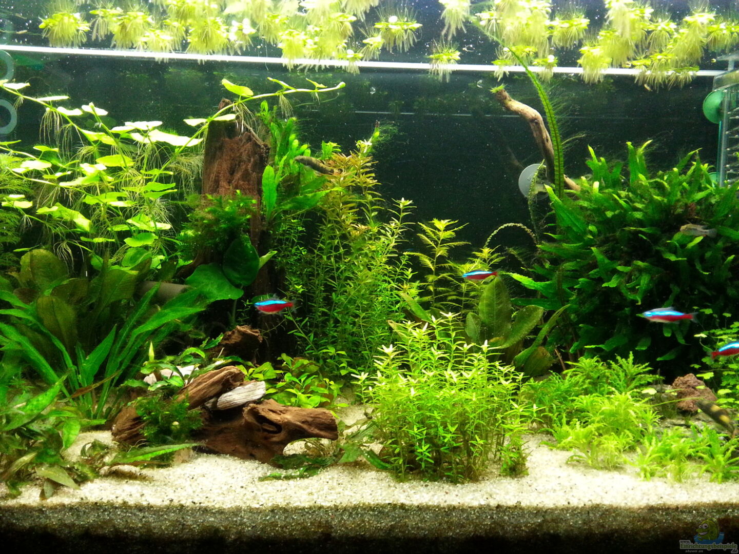 Anubia barteri / Zwergspeerblatt auf Wurzel und Stein Micrrosorum pteropus / Javafarn auf Wurzel Echinondorus Ozelot / rote Schwertpflanze Echinondorus / Schwertpflanze Rotala rotundifolia / kleine Rotala Heteranthera Zosterifolia / Seegrasblättriges Trugkölbchen Hydrocotyle leucocephala / Brasilianischer Wassernabel Hydrocotyle sibthorpioides / kleinblättriger Wassernabel Nymphaea lotus rot / Roter Tigerlotus Cryptocoryne wendtii / Wasserkelch Gedüngt wird: 1 [...]