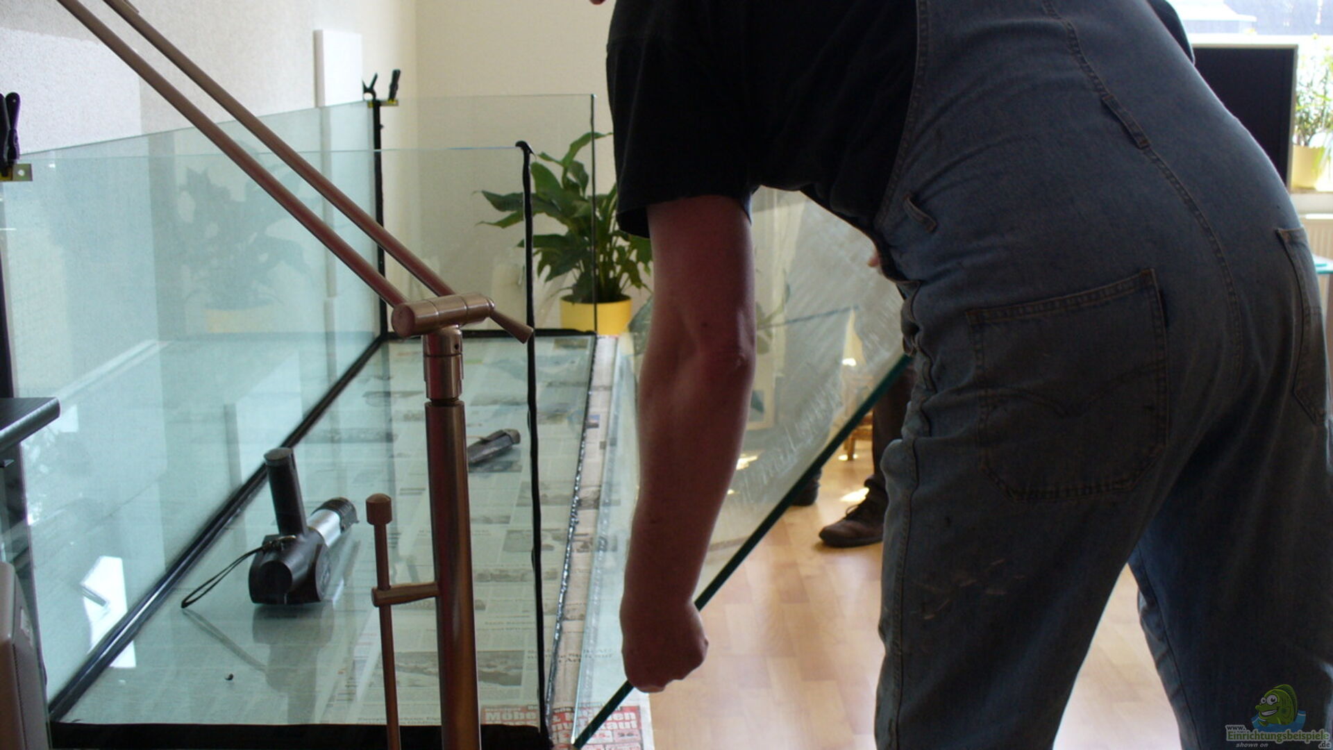 Verklebung vor Ort, Beckenunterbau: 16mm Multiplexplatte, Ytong-Steine, Leimholzplatte zur Lastverteilung und zum Schutz des Laminats, Rahmen unten/oben aus elox. Aluprofilen, Glasschiebeabdeckung. Geplant und gebaut 2008 und umgebaut/renoviert 2015 und abgebaut im Juni 2023 durch Aquarienbau Bernd Neu