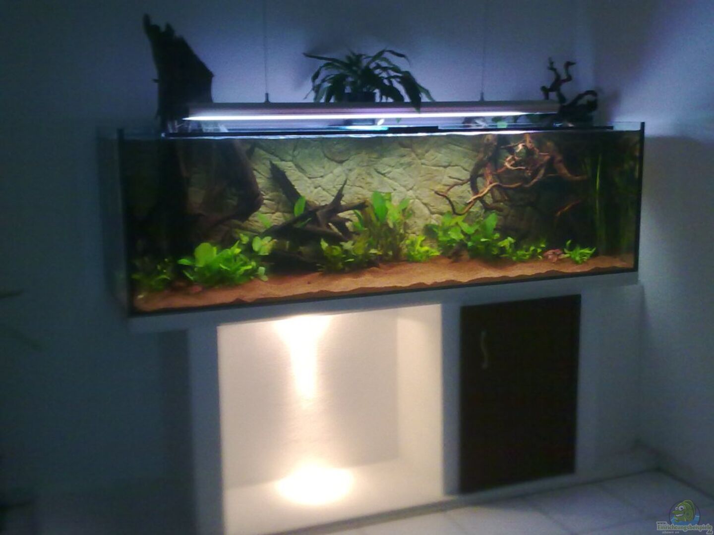 Stossverklebt 12mm Floatglas von der Firma Diamantaquarien D. Unterbau: - selbst Bau mit Ytong Steinen auf Bodenplatte (240cm auf 60cm) - Glas steht auf einer Küchenarbeitsplatte der Stärke 35mm - Feinverputz an Aussenseite - Technikschrank mit seitlicher Stromplatte und Montagebrett - indirekte Beleuchtung des Unterbaus