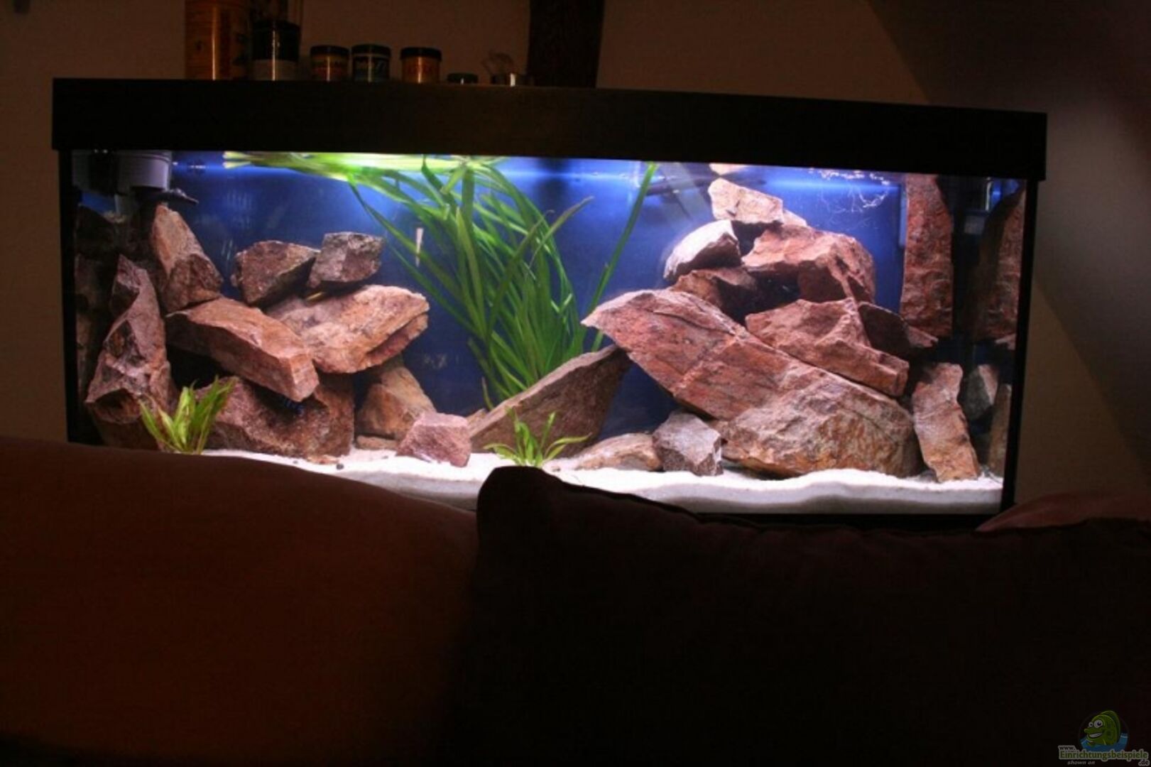 Das Becken steht auf einem ma??angefertigtem Unterschrank aus geöltem Kirschholz. Hat mir ein Hobbyschreiner gemacht. Schade nur das man ihn nicht wirklich sieht. Die Ma??e betragen 120x40x57. Durch die Höhe ist das Aquarium auf armlehnenhöhe des Sofas und wenn man sich gemütlich aufs Sofa knallt und ins Becken schaut muss man sich beherrschen um nicht einzuschlafen :-D