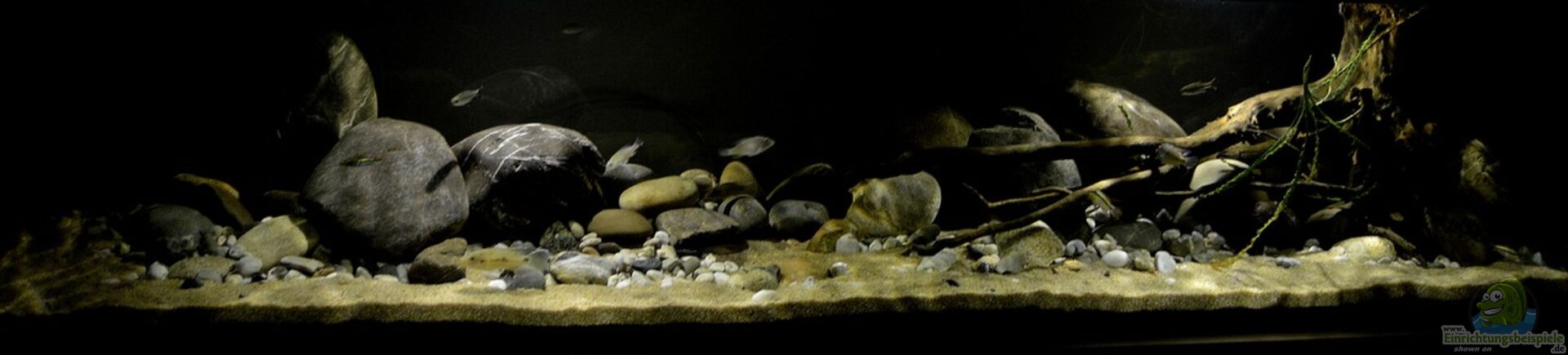 Dieses Aquarium hat ein Sonderma?? mit 200x40x40cm. Bewusst wählte ich dieses Ma??, da hier wunderbar ein schnellflie??ender Bachlauf imitiert werden kann. Es ist durchaus nicht üblich eine so geringe Tiefe und Höhe zu wählen, wer jedoch einmal Spa?? daran gefunden hat, will es nicht mehr missen. Die Tiere sind beinah alle mit 10-15cm ausgewachsen ausgenommen der Flösselhechte.