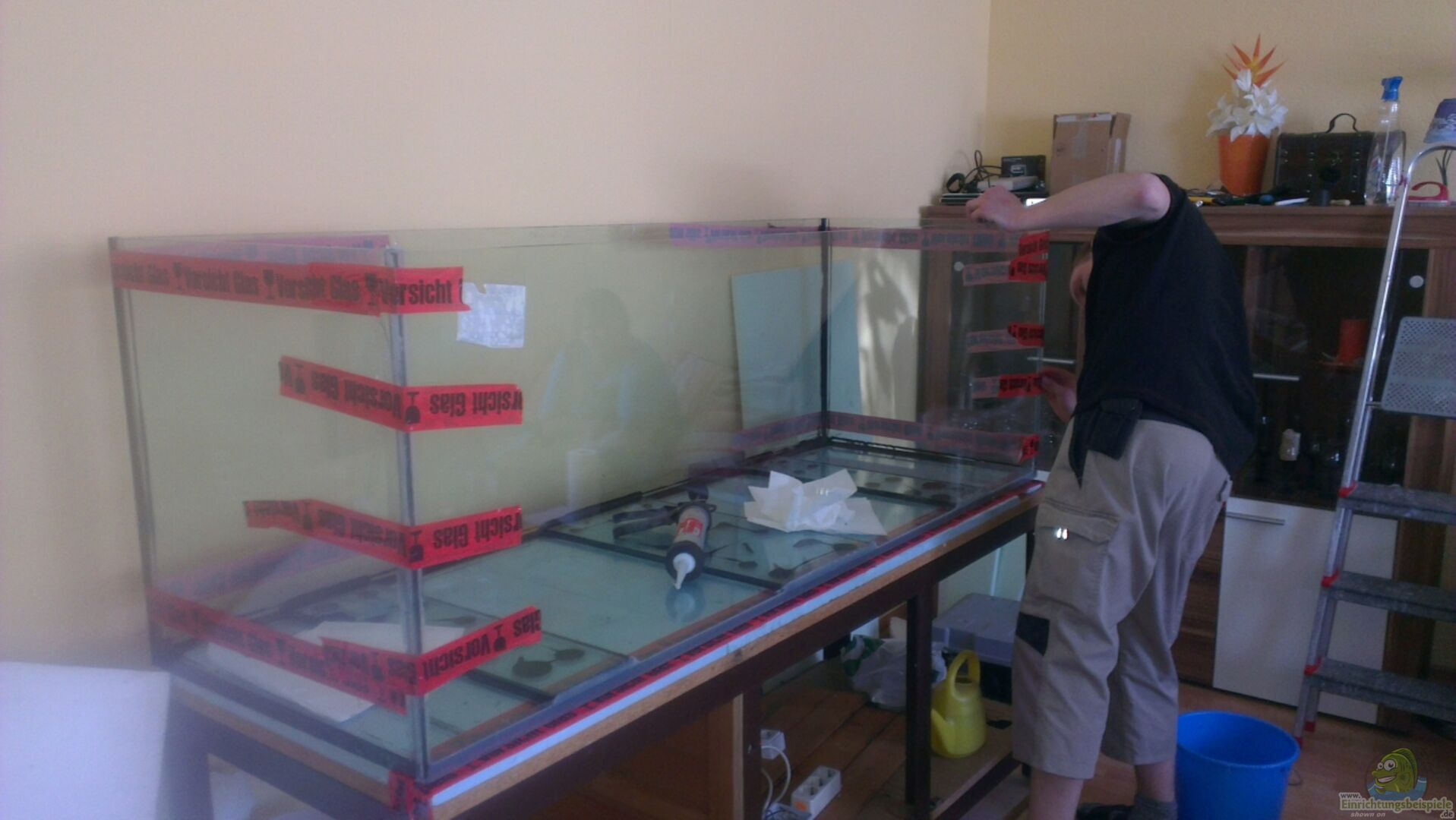 Das Aquarium ist ein Garagenfund. Das Becken steht auf einem geschwei??ten Stahlrahmen. Da die Scheiben aber so sehr verkratzt waren, habe ich mich dazu entschieden die Frontscheibe gegen eine neue zu tauschen. Im Zuge dessen, wurden auch alle Innennähte erneuert. Nach anfänglichen Bedenken, hält es aber bis jetzt dicht :-)