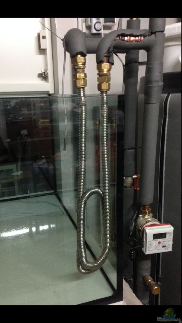Das Becken ist nach unseren Ma??en gefertigt worden und hat einen eingebauten 4 Kammer Bio Filter. Es ist in die Wand eingelassen und steht im gleichen Raum wie die Heizungsanlage, womit wir problemlos das Becken (solargestützt) heizen können. Wasserablauf, Zulauf und Waschbecken sind direkt am Becken installiert. Als Unterbau habe ich die Wände mit Kalksandsteinen geklebt und mit einer dicken Betonplatte abgeschlossen. Der obere Teil des Aquariums ist mit drei Wie??lacktüren abgehangen. [...]