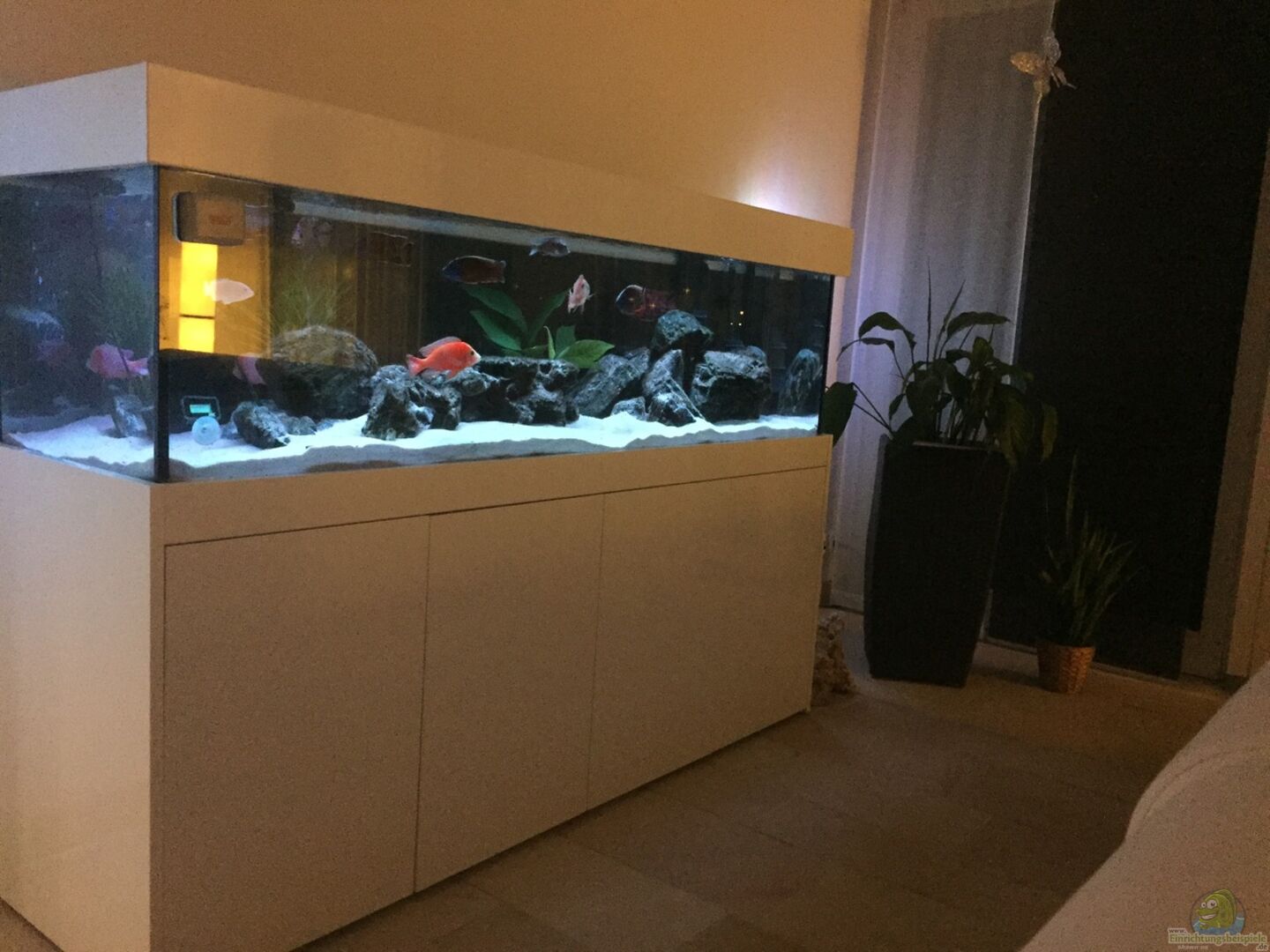 Das Becken und der passende Unterbau (Sideboard) wurde vom Schreiner bzw. Aquarienbauer massgefertigt. Das Möbel sowie Kiesblende und Abdeckung sind weiss, hochglanz. Die Rückwand ist komplett schwarz-matt, eine hinterlegte Styroporplatte sorgt für die Isolation des Beckens. Das Aquarium ist komplett und "rundum" aus Weissglas (optiwhite). Die elektronisch gesteuerte Wechselströmung (mittels der neusten EHEIM eGeneration) sorgt im Aquarium für naturnahe Strömungsverhältnisse, [...]
