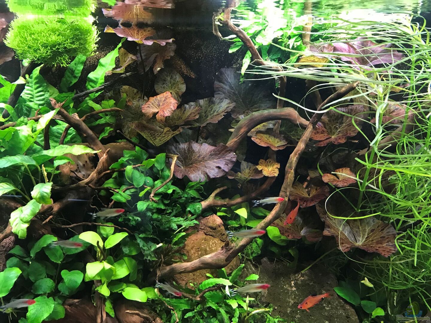 Der Rest der Einrichtung besteht aus Moorwurzeln, die ich mit Aquariensilikon zusammen geklebt habe. Rote Lava in Verbindung mit der Juwel "Rock" Rückwand rundet die Einrichtung ab. Ich habe statt Pflanzen noch weiteres Talawa Wood eingebracht, welches sich wirklich hervorragend als Wurzelholz im AQ macht. Es dunkelt nicht so arg ab, mit der Zeit und hält sich extrem lange unter Wasser. Man muss es allerdings extrem lange wässern oder mit Steinen beschweren. Es kann schon mal [...]