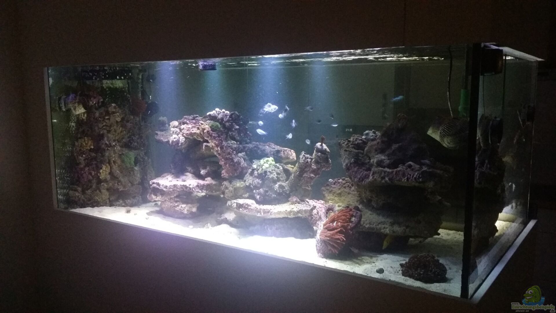 Filterbecken mit abfluss verbunden (wird umgebaut das der Abfluss zum teich geht) An der Aussenwand oben einen Abluftventilator angebracht und unten zuluftlöcher. In der Filterkammer ist Caulerpa taxifolia - Grünalge und wird wenn das Licht im Haupttank aus geht Beleuchtet (1x Aqua-Medic aquasunspot 12 W LED Spot) bis oben im Haupttank wieder das Licht angeht.