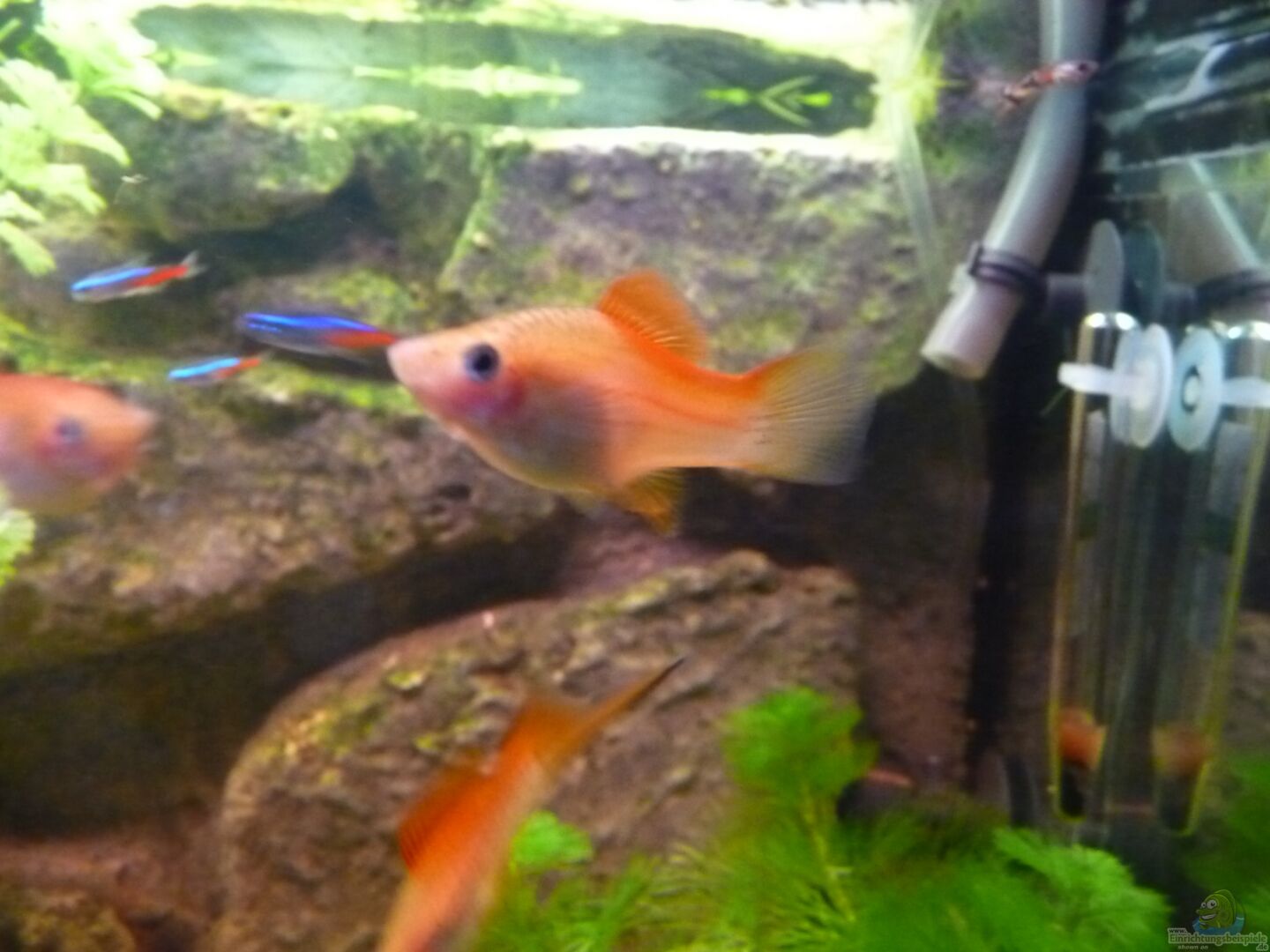Momentan sind : 6 Guppys 1M/5W (Poecilia reticulata) 4 Schwertträger 1M/2 W und ein Baby (Xiphophorus helleri) 21Neonsalmler (Paracheirodon innesi) 4 Schwarze Neons (Hyphessobrycon herbertaxelrodi) 3 Orangeflossen Panzerwelse, werden noch aufgestockt (Corydoras sterbai) 2 Goldsalmer (übriggebliebene) 1 Kardinalfisch (übriggebliebender) (Tanichthys albonubes)