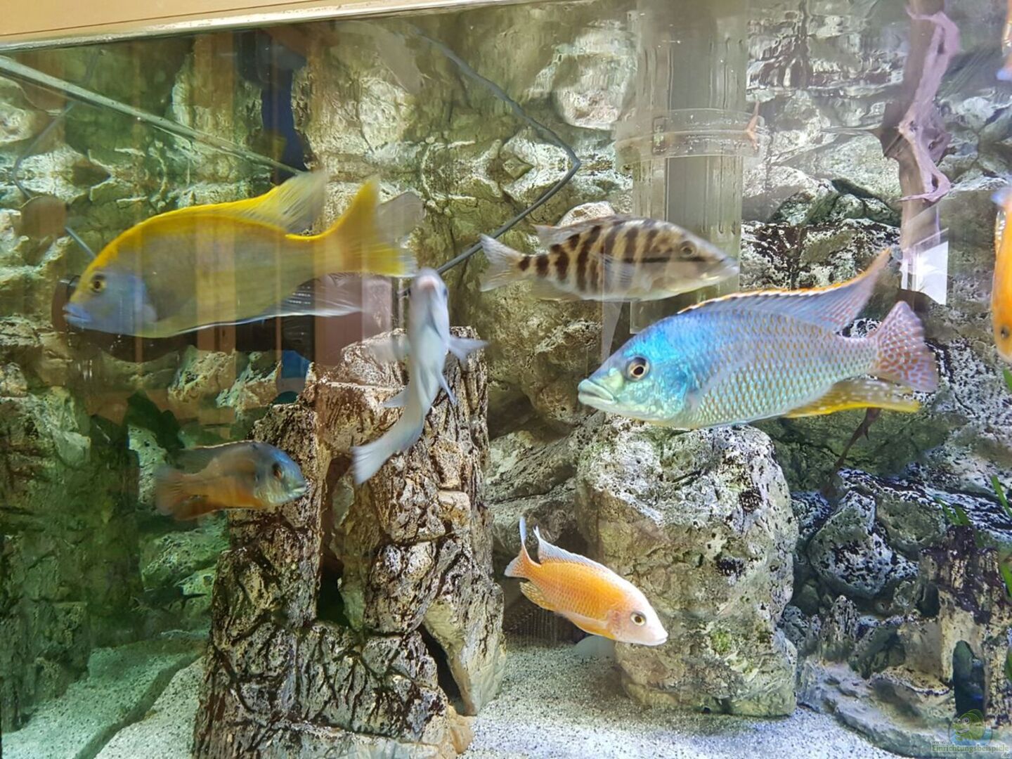 Hier findest Du traumhaft schöne Aquarien, die mit Buntbarschen der Art Nimbochromis polystigma (Vielfleckmaulbrüter) aus dem Malawisee besetzt sind.