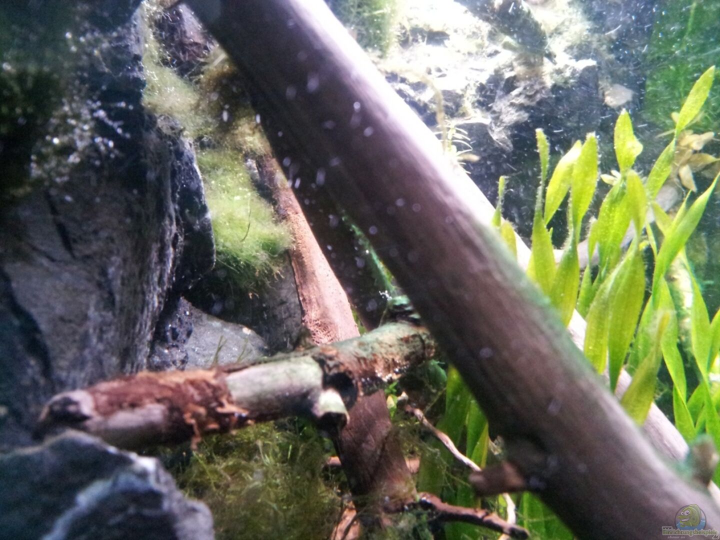 3D - Rückwand aus Basaltgestein marke Eigenbau mit vielen Versteckmöglichkeiten und Höhlen. Die Technik ist komplett hinter dem HMF - Filter verbaut. Der HMF - Filter ist versteckt hinter einem 3D - Wandmodul aus Basaltgestein auch Eigenbau. Es ist mit 2 cm Abstand zum HMF - Filter aufgestellt damit das Wasser ungehindert zirkulieren kann und die Garnelen können so denn Filter besser ´abweiden´.