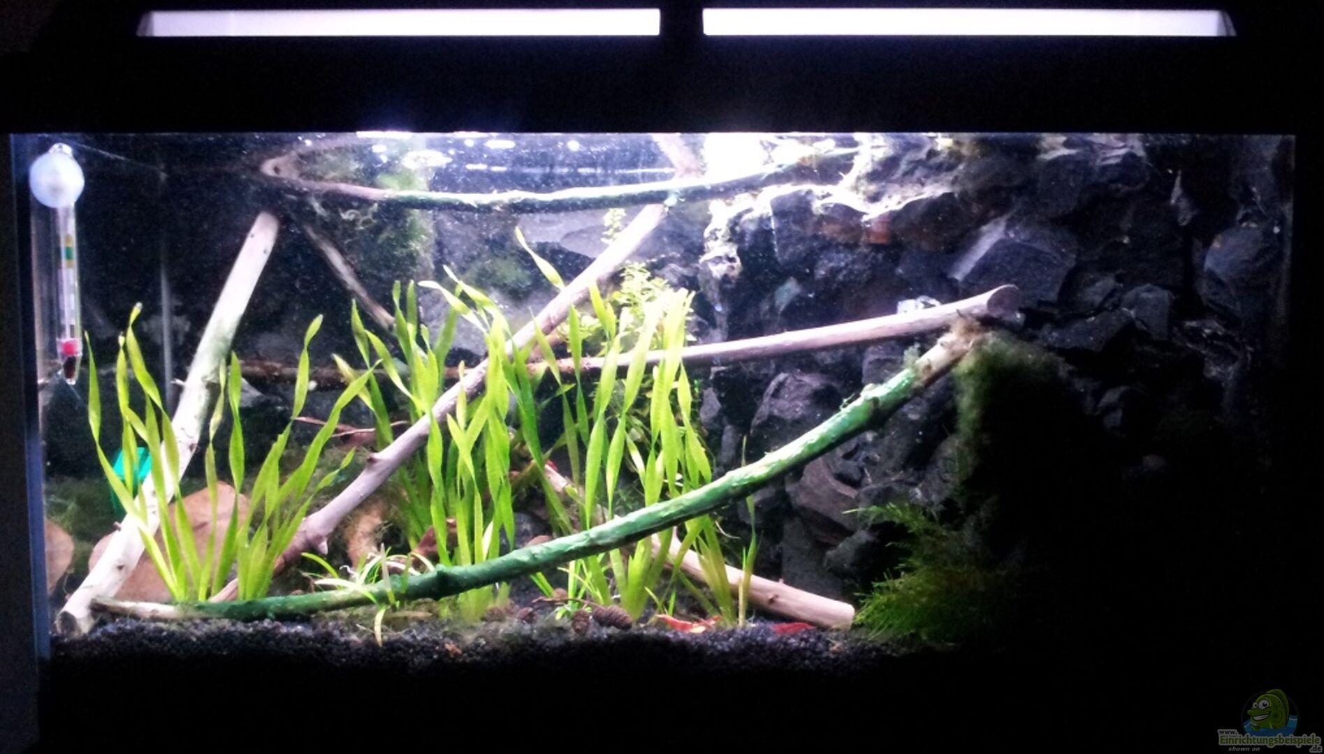 3D - Rückwand aus Basaltgestein marke Eigenbau mit vielen Versteckmöglichkeiten und Höhlen. Die Technik ist komplett hinter dem HMF - Filter verbaut. Der HMF - Filter ist versteckt hinter einem 3D - Wandmodul aus Basaltgestein auch Eigenbau. Es ist mit 2 cm Abstand zum HMF - Filter aufgestellt damit das Wasser ungehindert zirkulieren kann und die Garnelen können so denn Filter besser ´abweiden´.