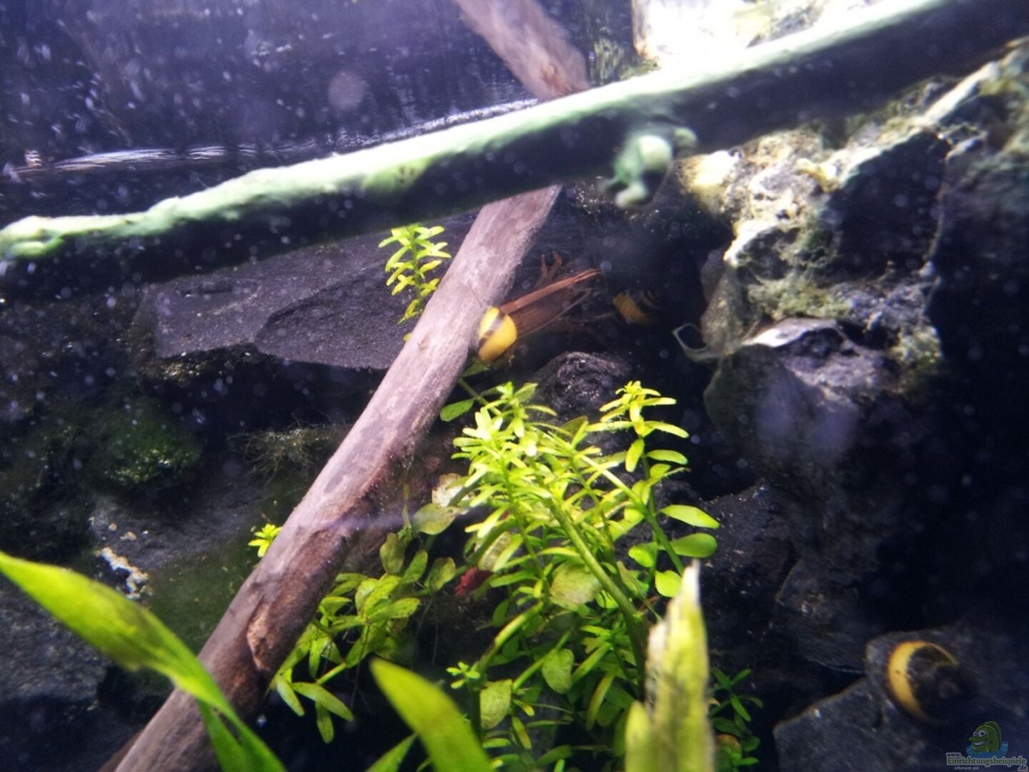 3D - Rückwand aus Basaltgestein marke Eigenbau mit vielen Versteckmöglichkeiten und Höhlen. Die Technik ist komplett hinter dem HMF - Filter verbaut. Der HMF - Filter ist versteckt hinter einem 3D - Wandmodul aus Basaltgestein auch Eigenbau. Es ist mit 2 cm Abstand zum HMF - Filter aufgestellt damit das Wasser ungehindert zirkulieren kann und die Garnelen können so denn Filter besser ´abweiden´.