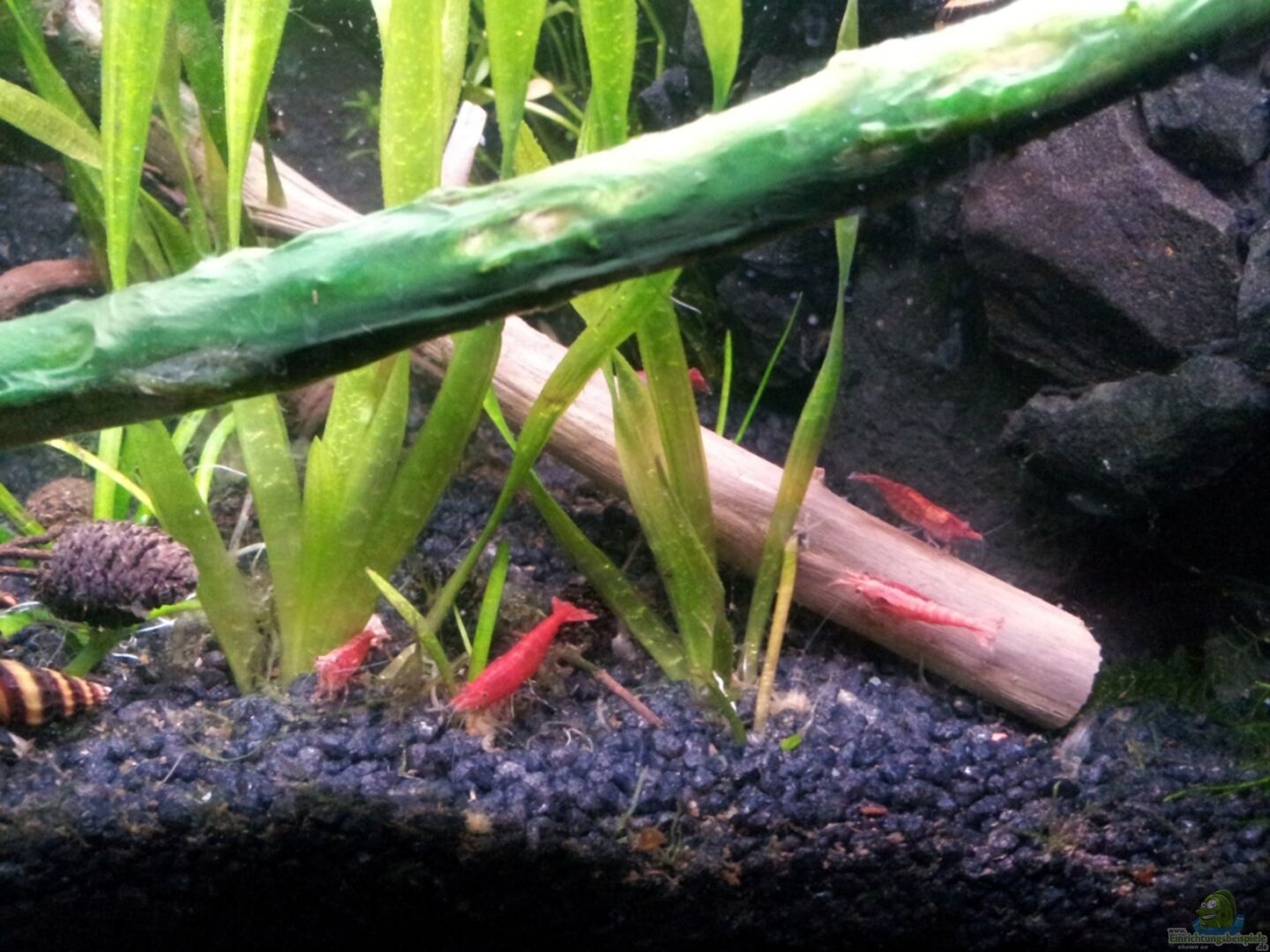3D - Rückwand aus Basaltgestein marke Eigenbau mit vielen Versteckmöglichkeiten und Höhlen. Die Technik ist komplett hinter dem HMF - Filter verbaut. Der HMF - Filter ist versteckt hinter einem 3D - Wandmodul aus Basaltgestein auch Eigenbau. Es ist mit 2 cm Abstand zum HMF - Filter aufgestellt damit das Wasser ungehindert zirkulieren kann und die Garnelen können so denn Filter besser ´abweiden´.