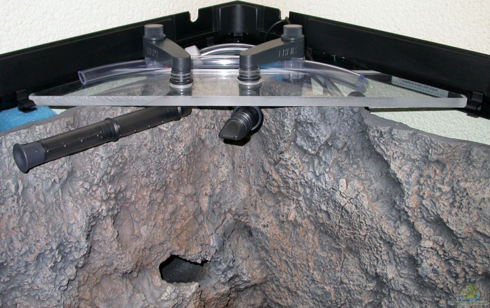 Strömungspumpe: Eheim streamON 1800 - 2, 8 W - 1800 l/h von 10:00 bis 20:00 Uhr Luftpumpe: Eheim air pump 200 - 3, 5 W - 2 Ausströmer 2x Tetra CV 4 Rückschlagventil Die Ausströmer wurden in zwei Bereichen hinter der Rückwand angebracht, in denen wenig Wasserbewegung herrscht und soll auch eine Kahmhautbildung verhindern. Laufzeit morgens und abends jeweils 1/4 h. Wasserwechselpumpe: hydor - 4, 5 W - 250 l/h (dient mehr oder weniger nur zum "Ansaugen", [...]