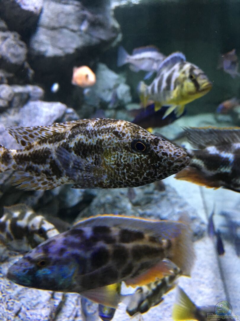 Hier findest Du traumhaft schöne Aquarien, die mit Buntbarschen der Art Nimbochromis polystigma (Vielfleckmaulbrüter) aus dem Malawisee besetzt sind.