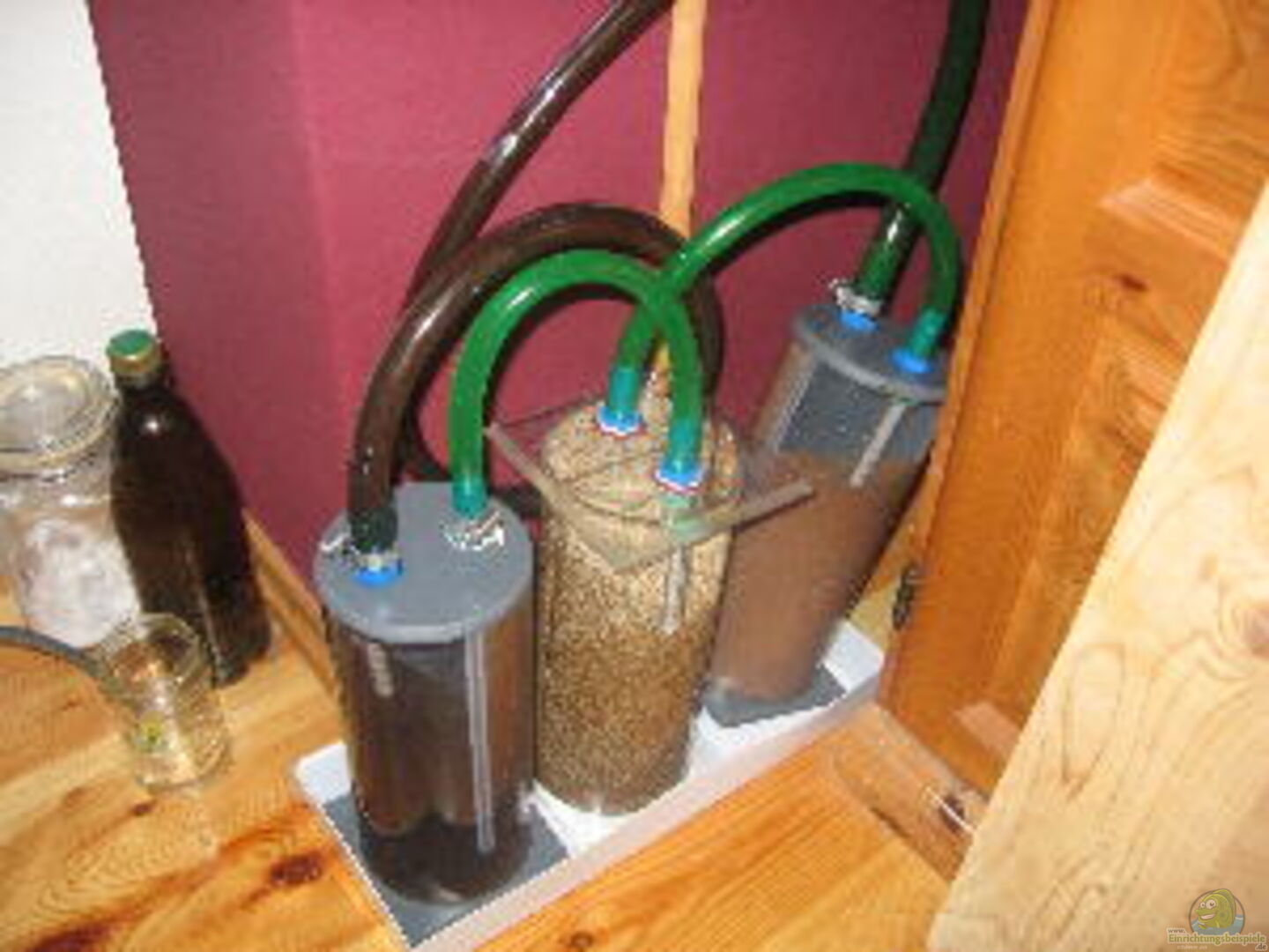 Drei Nitratfilter a/1, 7 Ltr. sorgen für fast Nitratfreies Wasser. Eine Eheim Pumpe (regelbar) ist nur für die Nitratfilter im Einsatz. Es wurde zusätzlich eine Eheim Strömungspumpe mit 650 Liter/Std. in die obere rechte Aquarienecke gesetzt. Die Pumpe ist mit Steinen verdeckt.
