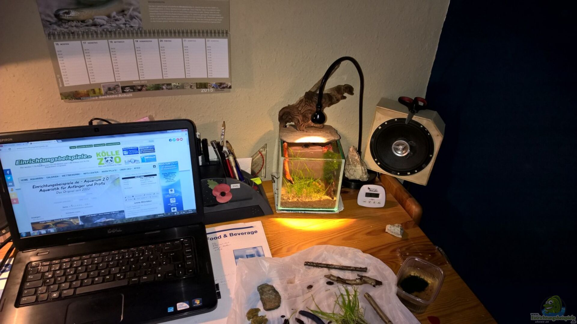 Dieses Becken ist ein kleiner Versuch das Füttern meiner Kakadubuntbarsche mit einer hübschen Schreibtischdeko zu vereinen. Da ich in meinem zweiten Becken keine ganze Tüte Wasserflöhe füttern möchte, habe ich nach einer Aufbewahrungsmöglichkeit gesucht. Im Keller fand ich dann dieses Minibecken und schon war die Idee geboren. Bin gespannt wie sich dieses sehr kleine Biotop entwickelt und ob sich eventuell die Wasserflöhe vermehren, sodass ich nicht ständig nachkaufen muss.