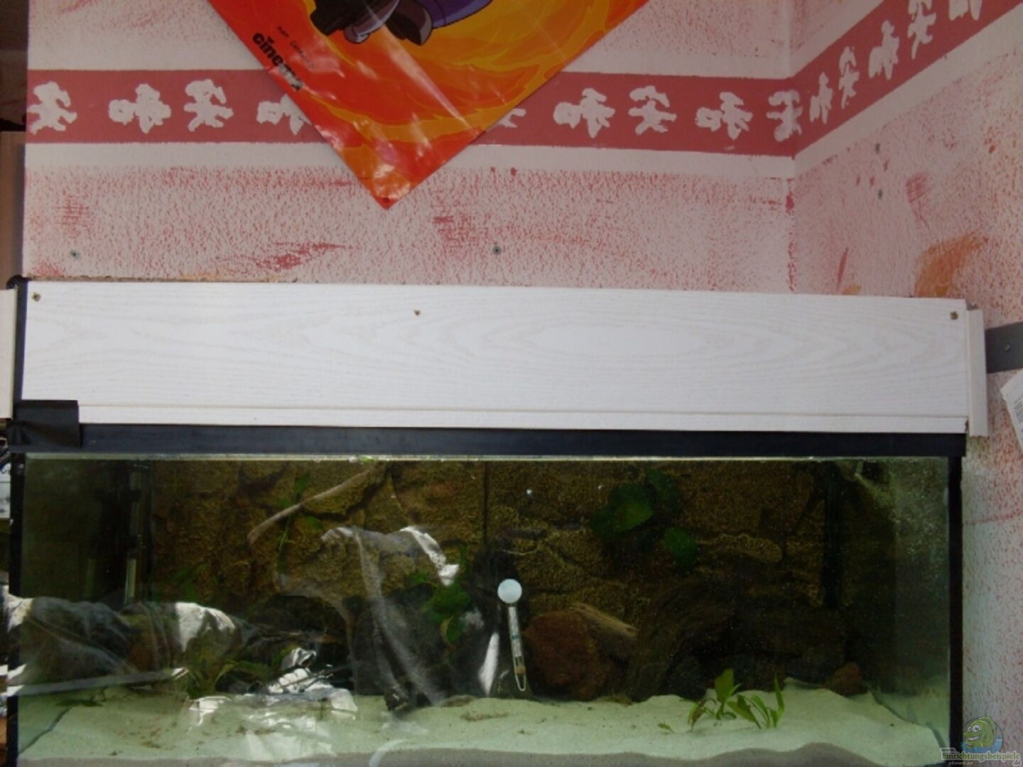 22mm dicke Rückwand um ca. 6° nach hinten geneigt, restlichen Seitengläser 15mm. Frontscheibe durch Querplatte (21 cm breit / 0.7 mm Glas) mit Rückwand verbunden. Rückwand mit schwarzem Kies verkleidet. Becken und Unterschrank, Marke Eigenbau. (2. Versuch) (Baugleich mit dem becken von domenik laufer) Rückwand von juwel rockoptik braun