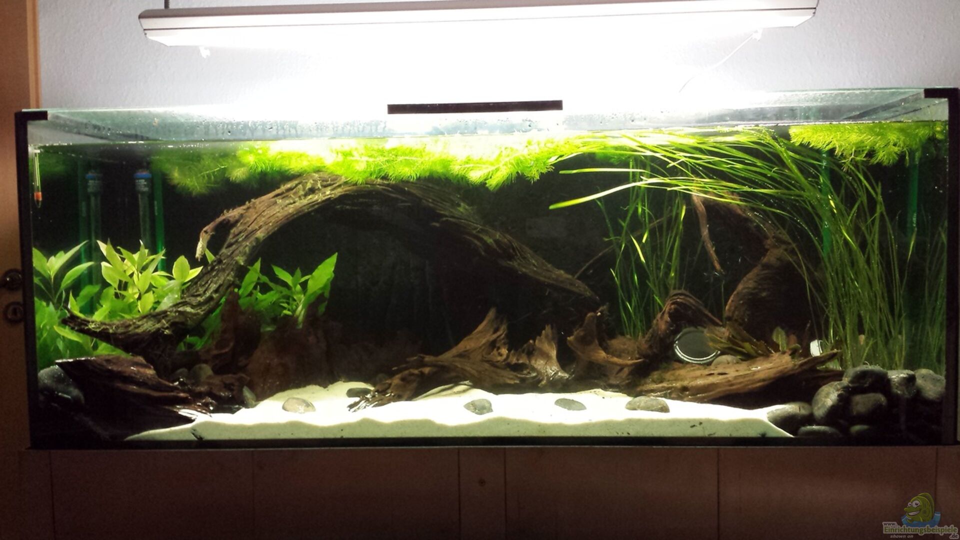 - Zahlreiche Mangrovenwurzeln von 20 bis 120 cm Länge - Beachpebbles - schwarze, runde Steine um 10 - 15 cm; etwa 25 kg - ??ste der deutschen Eiche - 2 x Kunststoffröhre als Messerfischversteck; wurde optimal angenommen, versteckt unter Wurzeln und Steinen Wurzeln angeordnet wie ein ??berhang am Ufer, also bogenförmig und sich gegenseitig abstützend. Dazwischen nach unten ragende ??ste. Nach hinten dunkelt es sich durch den gebauten ??berhang stark ab. - schwarze Rückwand, [...]