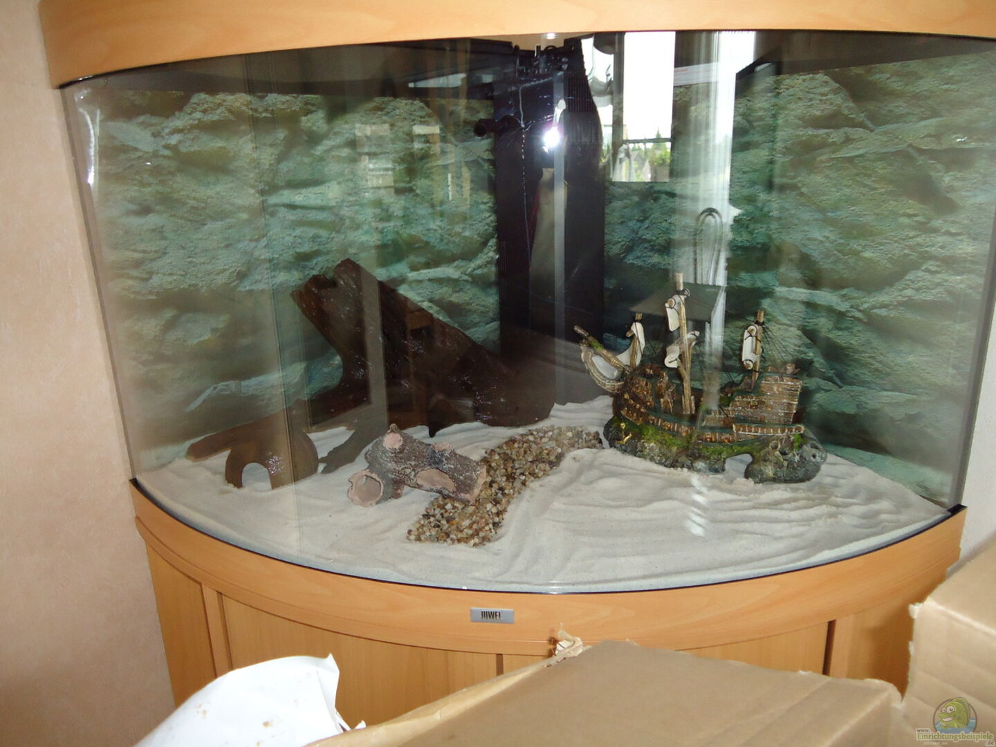 1 x Wurzel 1 x Deko - Schiff 2 x Brut-Röhre 1 x Kokosnusshälfte mit Einschwimmloch Steine zu zusätzlichen Verstecken aufgestockt