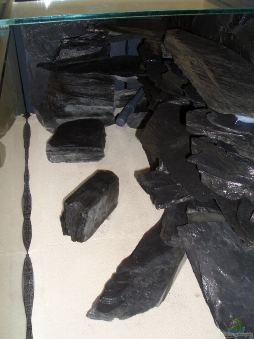 Rückwand eigenbau aus ca. 130 kg schwarzer Bruchschiefer wurden auf zuvor verklebte und mit schieferfarbenem acryllack gestrichenem styrodurplatten geklebt. mit Aquariumsilikon verklebt und geschichtet.daraus ergeben sich jede menge Höhlen und Unterstände