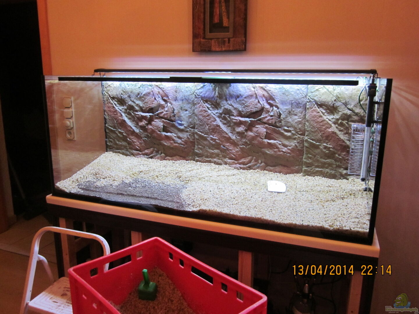 Der Unterschrank ist ein Eigenbau des Erstbesitzers aus Kanthölzern, einer Küchenarbeitsplatte und einer Aquarienunterlage von JBL. Die drei Türen die die Technik und viele Utensilien verbergen sind aus Sperrholz, mit handesüblichen Möbelgriffen aus Alu und werden mit Magneten an den Kanthölzern gesichert.Hier hat sich der Erbauer richtig Gedanken gemacht, vielen Dank.