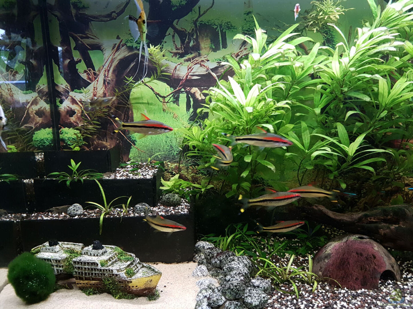 1 x Guppy 1 x Zebrabärblinge 8 x Amano Garnele 8 x Puntius denisonii 5 x Corydoras paleatus 1 x Antennenwels 25 x Paracheirodon innesi 2 x Pterophyllum scalare