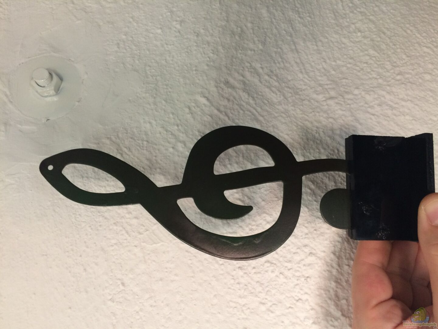 Die "Schallplatte" habe ich in Epoxidharz eingegossen, da sich auf der Vorderseite ein Papierlabel befindet, welches sich ansonsten im Wasser abgelöst hätte. Dieses hat einige Versuche gekostet, bis dass Harz wirklich blasenfrei ausgehärtet war. . Den Notenschlüssel habe ich aus schwarzem Acrylglas angefertigt. . Zur weiteren Dekoration wurde eine künstliche Wurzel verwendet. Dennerle Nano Decor Crusta Root M. . Als "Rückwand" dient eine Photo-Rückwand "Beauty+Sea", [...]