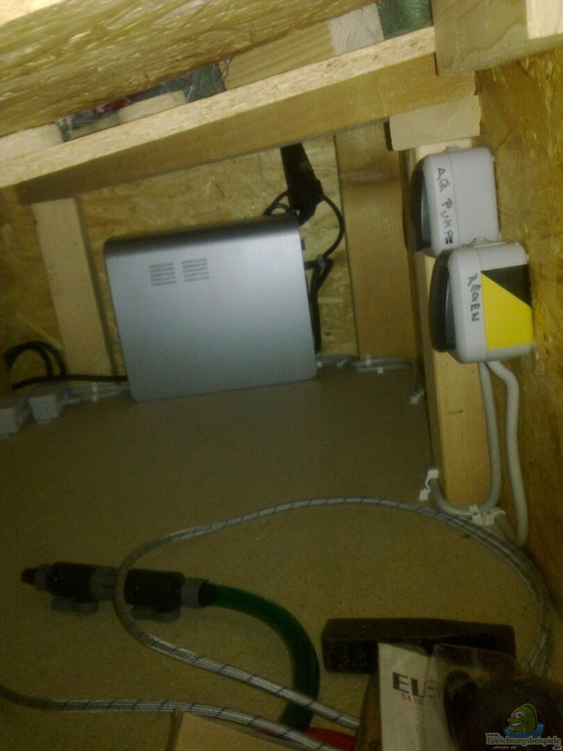 Ein 50W Heizstab für das Aquarium ist im Filter Ablauf auf der rechten Seite integriert. Der Ablauf ist ein 100mm Rohr, welches die Heizung und auch den eigentlichen 12/16er Ansaugschlauch versteckt. Das musste sein, damit sich die eigentlichen Pflegetiere nicht am Heizstab verbrennen können. Dazu kommt, dass die schmalen (ca. 2mm) Schlitze im Rohr als Vorfilter den gröbsten Dreck abhalten Der Boden Grund des Landteils wird mit einer 150 Watt Fu??bodenheizung beheizt. Durch das aussparen [...]