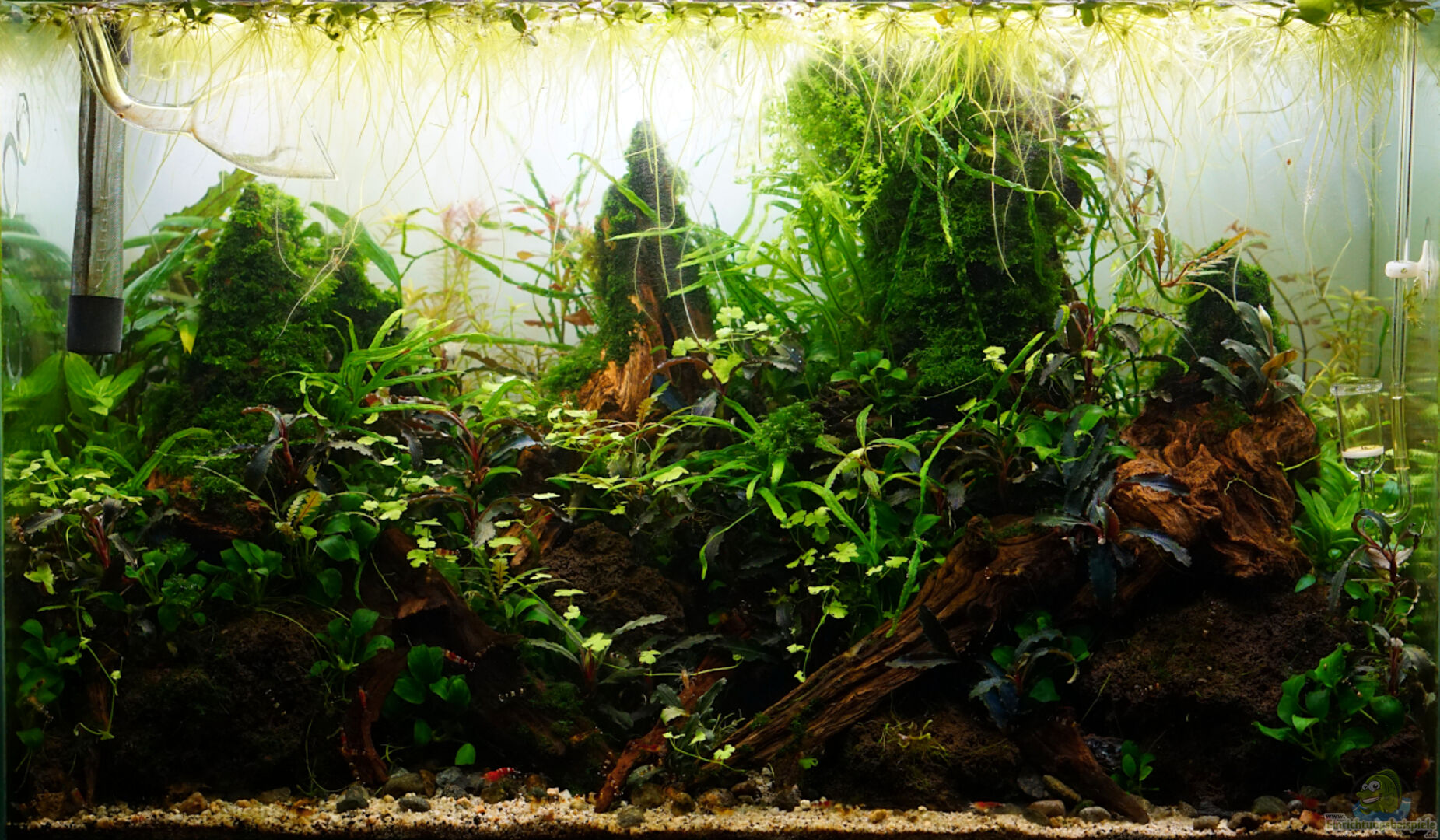 Es handelt sich um ein transparent verklebtes Glasgarten-Aquarium aus einfachem Floatglas, welches ich schon seit einigen Jahren habe. Neu ist der Unterschrank im ADA-Stil, den ich aus 19 mm MDF Platten gebaut habe.