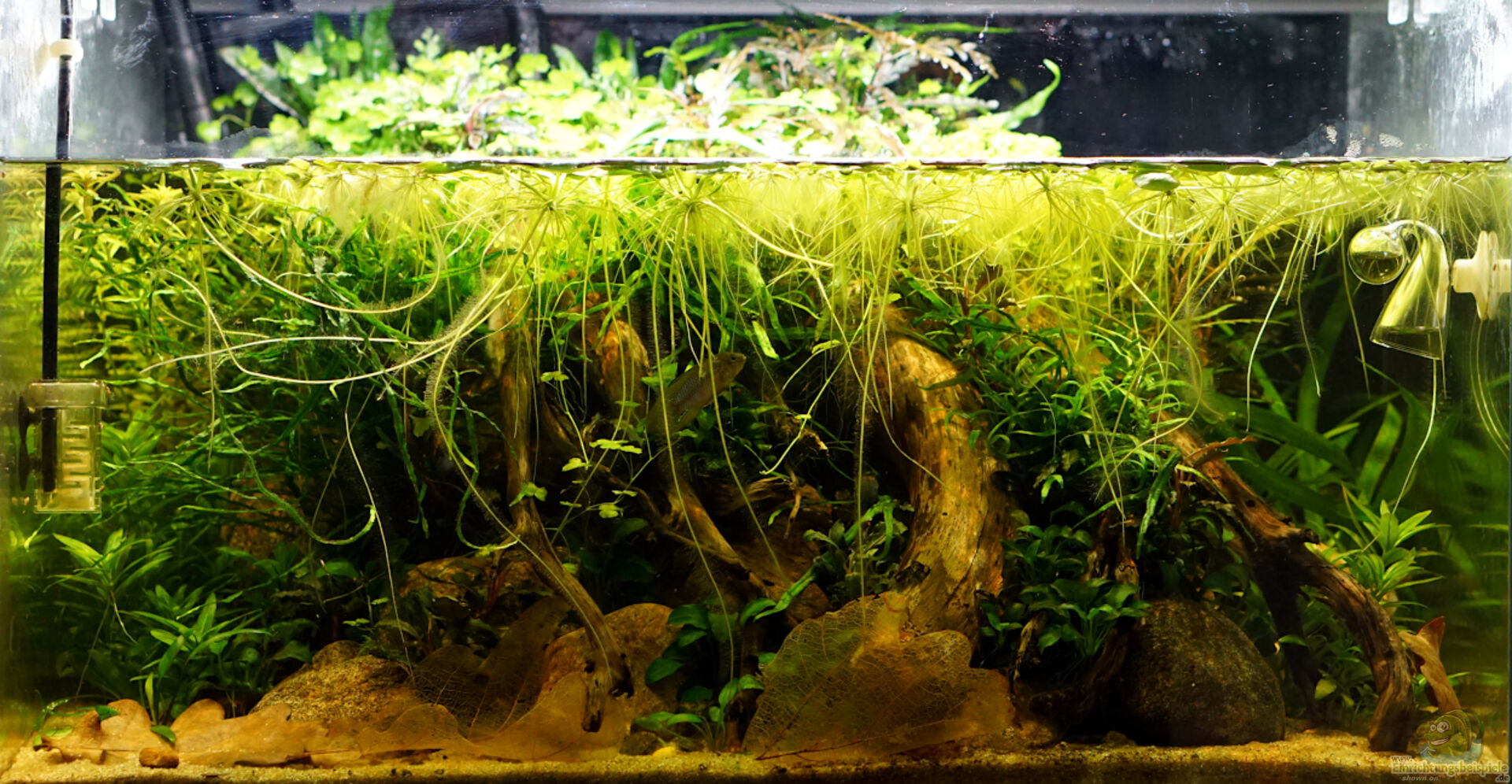 No-Name Becken mit transparenter Verklebung in Poolbauweise. Das Becken ist nur zu etwa 3/4 mit Wasser gefüllt und hat einen kleinen emersen Teil.