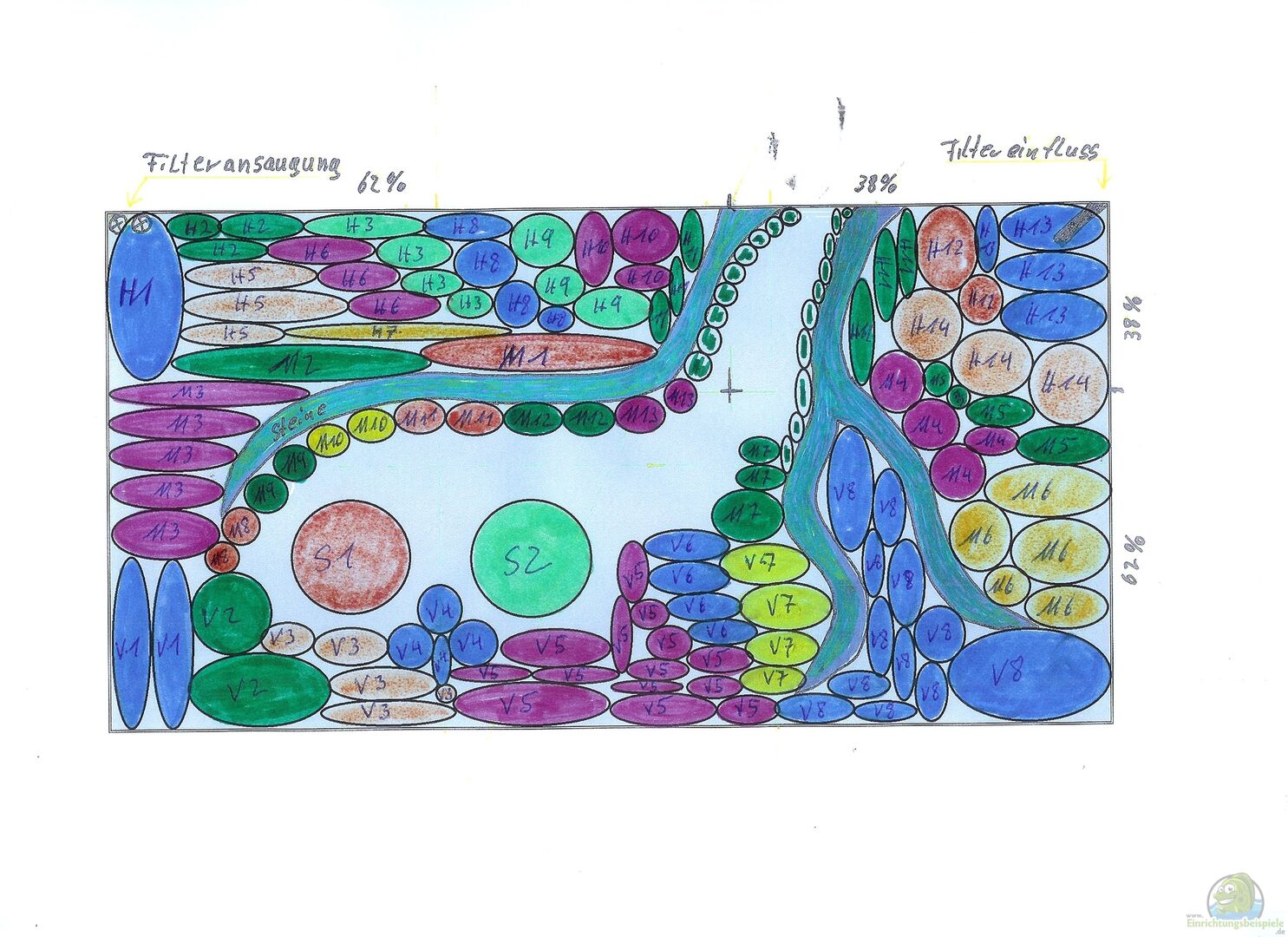 H = Hintergrundpflanzen M = Mittelgrundpflanzen V = Vordergrundpflanzen S = Solitärpflanzen ------- H1 = 2x ? H2 = 3x Cognac Pflanze H3 = 4x Quirlblättrige Sternpflanze H4 = 4x Gro??es Fettblatt H5 = 5x Kleine Rotala H6 = 5x Schmalblättrige Ludwigie H7 = 5x Indisches Sternkraut H8 = 6x Riesencabomba feinblättrige H9 = 5x Kriechende Ludwigie H10 = 6x Blütenstielloser Sumpffreund H11 = 10x Riesen-Wasserfreund H12 = 4x Schmalblättriger Wasserfreund H13 = 5x Sumpfheusenkraut [...]