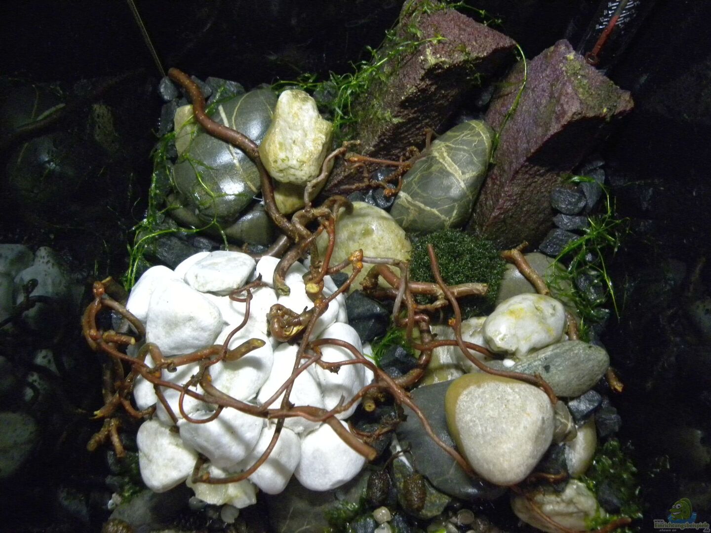 Steinhöhlen und Steinaufbauten selbst gebaut. Flu??kieselsteine und Aquariumsilikon machen es möglich. (So ist auch eine mögliche Einsturzgefahr ausgeschlossen) Neben den Steinaufbau noch Zweige vom Korkenhaselnussbaum aus dem eigenen Garten. Walnussblätter vom eigenen Garten. Dazu noch Erlenzapfen, Eichenblätter und Buchenblätter, die ich online vom Aquaristikshop gekauft habe. Kleine leere Schneckenhäuser runden die Deko ab, ebenfalls vom Aquaristikshop online gekauft.