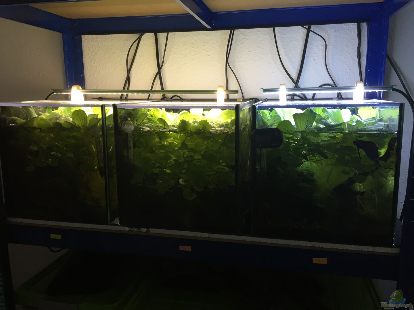 Es handelt sich um 3 einzelne 25 Liter Aquarien. Die Seiten- und Rückscheiben sind mit schwarzer Klebefolie beklebt, damit sich die drei Kampffische nicht sehen können. Die Aquarien sind mit Plexiglasscheiben abgedeckt.