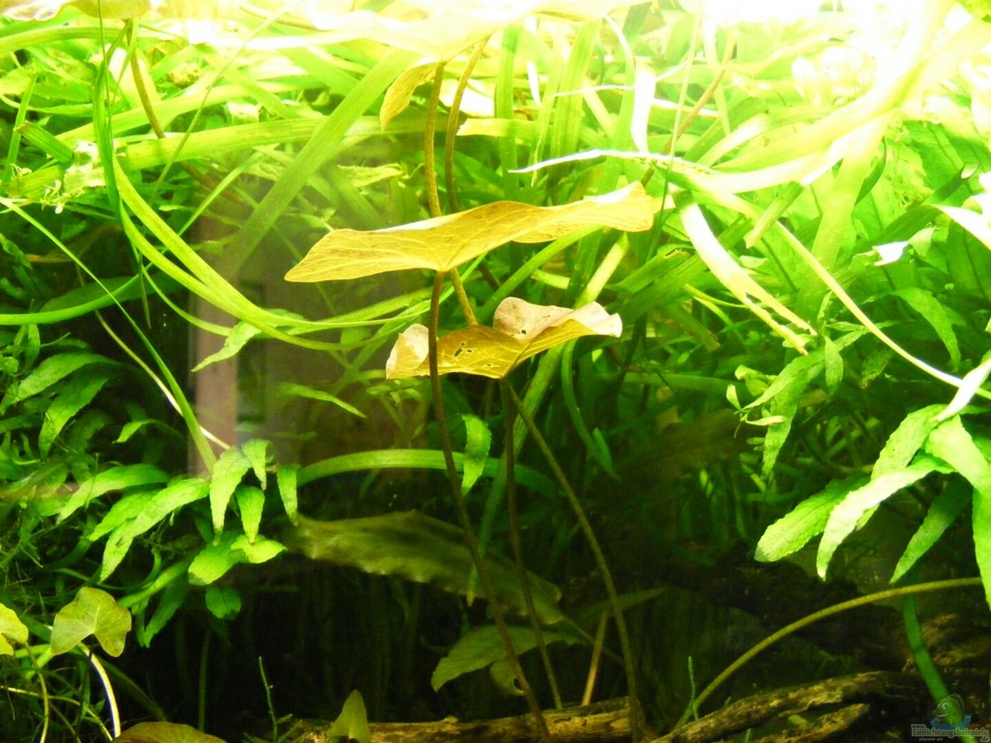 Hintergrund: 4 x Vallisneria spiralis "Tiger" 1 x Nymphaea lotus var. ´"Red" Mitte: 2 x Cryptocoryne wendtii 2 x Microsorum pteropus "Narrow" (auf Rebenholz befestigt) Vordergrund: 1 Portion Taxiphyllum barbieri 2 x Marsilea hirsuta Bei diesen Angaben handelt es sich um die Anzahl der Pflanzen, wie ich sie beim Einrichten verwendet habe. Natürlich haben sie sich mittlerweile stark vermehrt, so dass ich keine Angaben über die aktuelle [...]