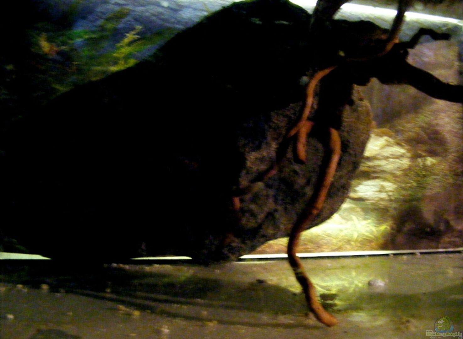 Oberes Becken mit Rückwandmodul ´Aqua-Pro´, innen hohl als gro??e Versteckmöglichkeit... Rotholzwurzel, Sumpfwurzelstamm.... Steine Unteres Becken selbstgebaute Reliefrückwand als ??bergang zum oberen Becken... gro??e Steine (grüner Granit)pH-neutral kleinere Steine Wurzelholzstücken Bambuszweige für ??stenachstellung