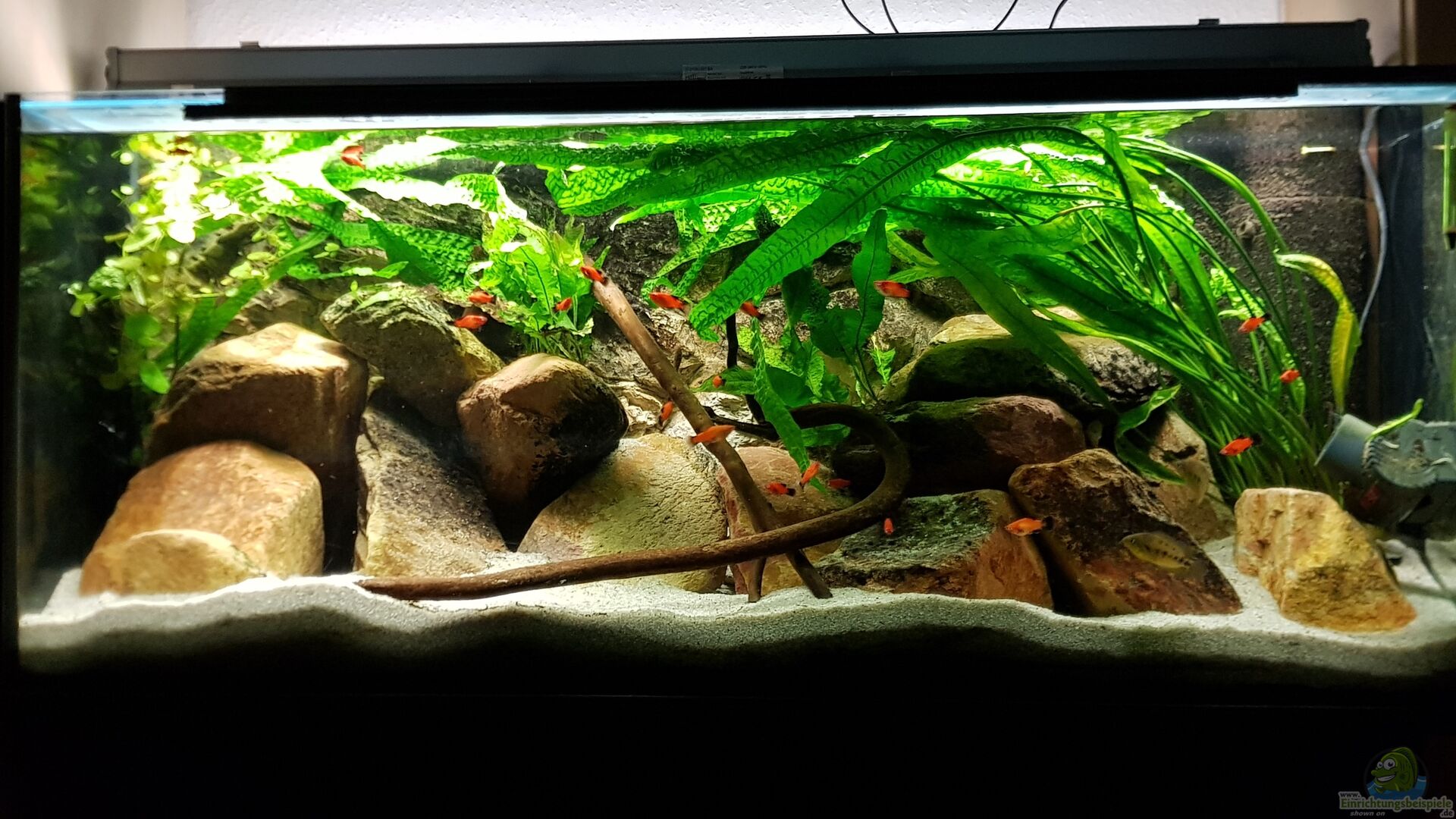 Cryptoheros nanoluteus ist ein vergleichsweise kleiner Buntbarsch aus Mittelamerika (m bis zu 11cm, w bis zu 6cm). Die Tiere leben in Flie??gewässern Panamas und bevorzugen dort Bereiche mit reichlich Verstecken zwischen Steinen, Wurzeln und der Ufervegetation. In diesem Becken habe ich versucht das typische Erscheinungsbild eines felsigen Flussbiotops aus Mittelamerika nachzuempfinden und den C. nanoluteus ein Biotop zu gestalten, das den Gegebenheiten ihrer natürlichen Herkunft entspricht. [...]