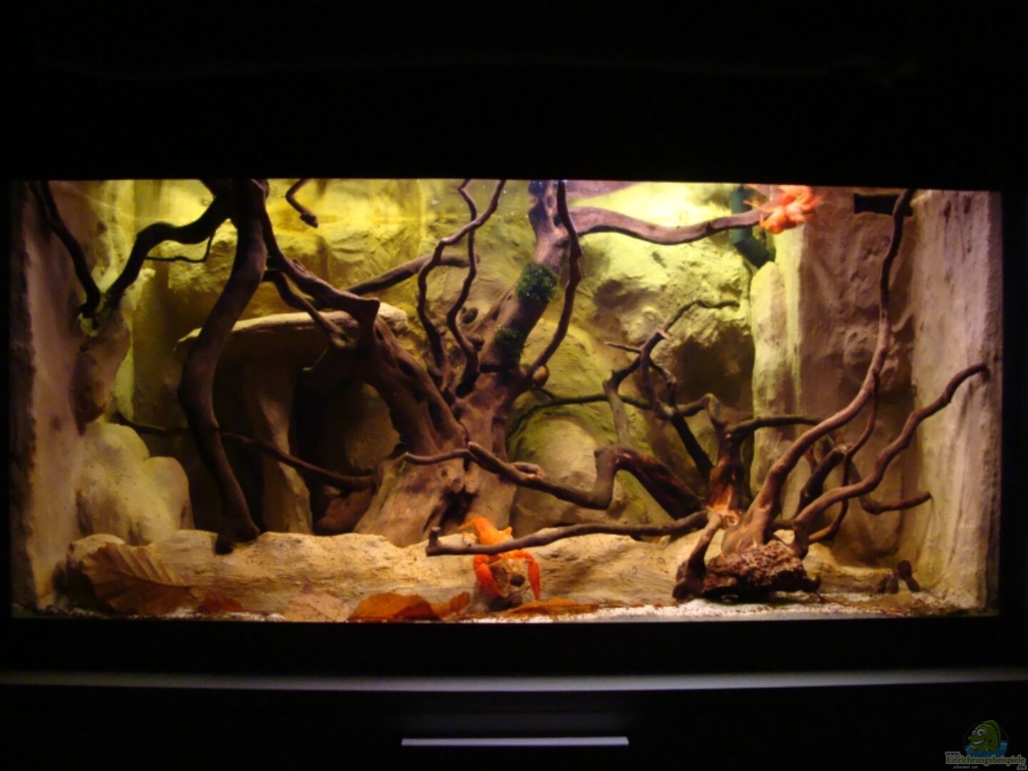 Standard-Glasbecken, Kiesblende und Abdeckung (die obere Wasserlinie und der entstehende Kalkrand sind somit nicht zu sehen) mit der Beleuchtung von einem alten Juwel-Becken übernommen, passend lackiert. Rück- und Seitenwände selber gebaut aus Styrodur und eingefärbtem (Abtönfarbe) Portlandzement, mehrere Höhlen für einen ausgewachsenen Krebs und eine Aussichtsplattform integriert, der Innenfilter ist komplett verkleidet, der Wasserauslauf des Innenfilters ist aus dem Becken herausgeführt, [...]