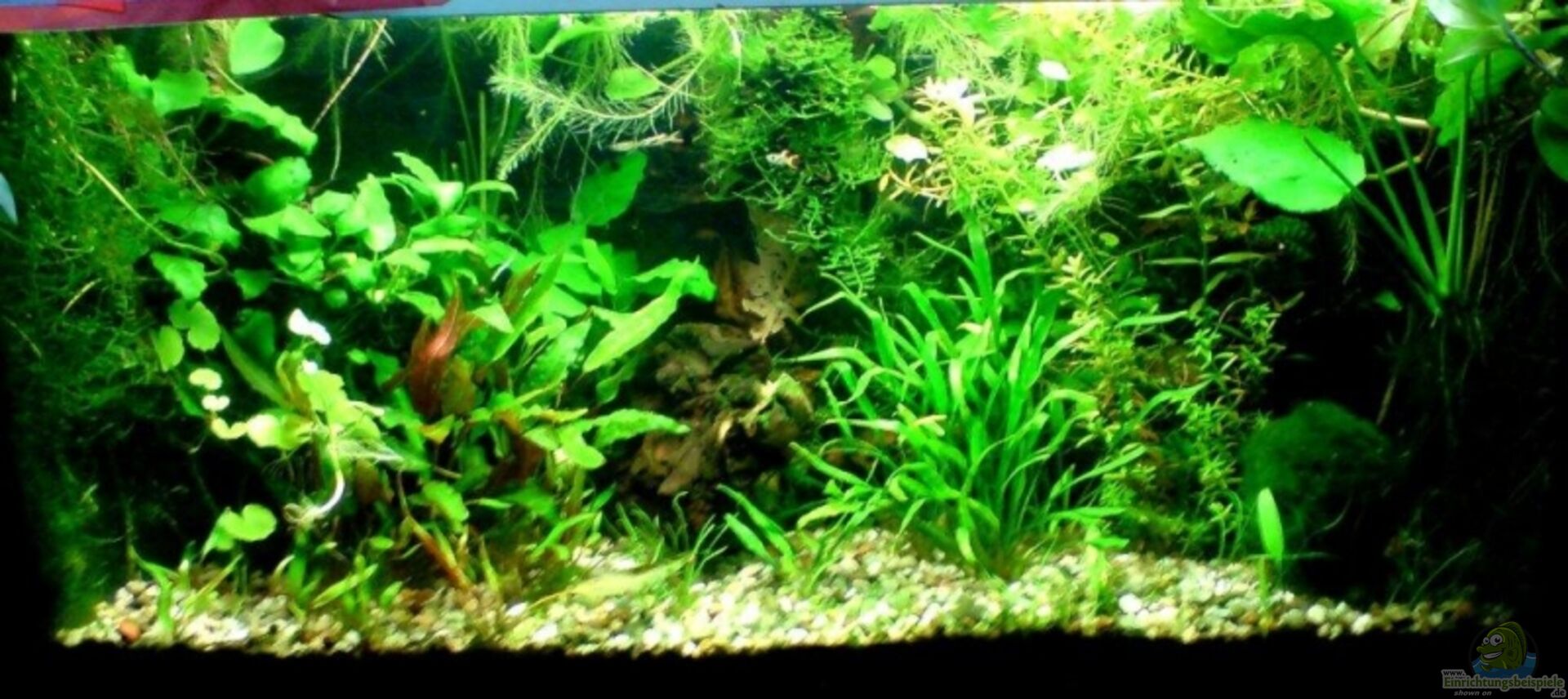 Das Becken ist offen und steht auf einem selbst gebauten Unterschrank. Bis August 2007 war das Aquarium mit einer Scheibe abgedeckt, hatte eine 15W Leuchtstofflampe, bekam kein CO2 eingeleitet und wurde, au??er über das Futter, nicht gedüngt. Ging auch, war aber nicht so schön.