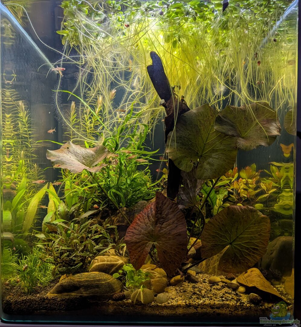 Hintergrund: Rotala rotundifolia Ludwigia repens "Rubin" Ludwigia palustris "Super Red" Mitte: Nymphea Lotus Lobelia cardinalis "Mini" Cryptocoryne undulata "Broad Leaf" Cryptocoryne nurii var. raubensis "Rosen Maiden" Aufsitzer: Anubias barteri var. coffeifolia Bucephalandra sp. "Kedagang" Bucephalandra micrantha "Needle Leaf" Microsorum trident Taxiphyllum barbieri "Java" Schwimmpflanze: Limnobium [...]