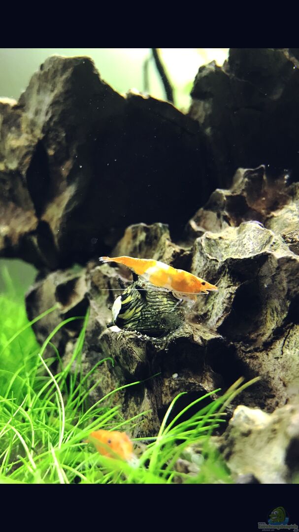 Wie in der Beschreibung beschrieben: Orange Sakura, Orange Rili, Goldene Tigergarnele und 3 Endler Guppys(Männlich) und paar Renn und Geweihschnecken und Amanogarnelen.