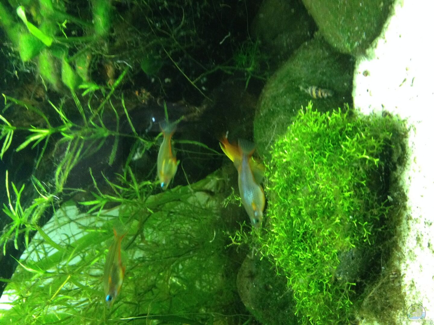1 Paar Goldene Honigguramis (mit Nachwuchs) 8 Oryzias woworae (Reisfische) 4 Metallpanzerwelse 8 Keilfleckbärblinge einige (nicht zählbar) orangene Sakura-Garnelen etliche Raubschnecken