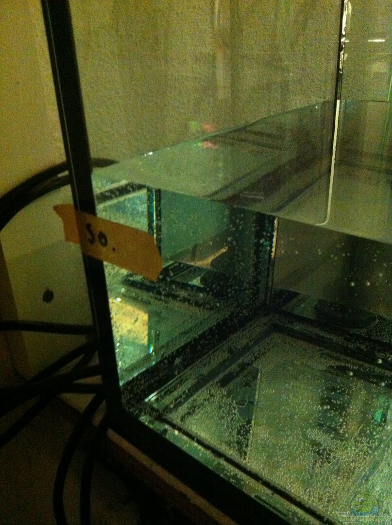 Filterbecken mit abfluss verbunden (wird umgebaut das der Abfluss zum teich geht) An der Aussenwand oben einen Abluftventilator angebracht und unten zuluftlöcher. In der Filterkammer ist Caulerpa taxifolia - Grünalge und wird wenn das Licht im Haupttank aus geht Beleuchtet (1x Aqua-Medic aquasunspot 12 W LED Spot) bis oben im Haupttank wieder das Licht angeht.