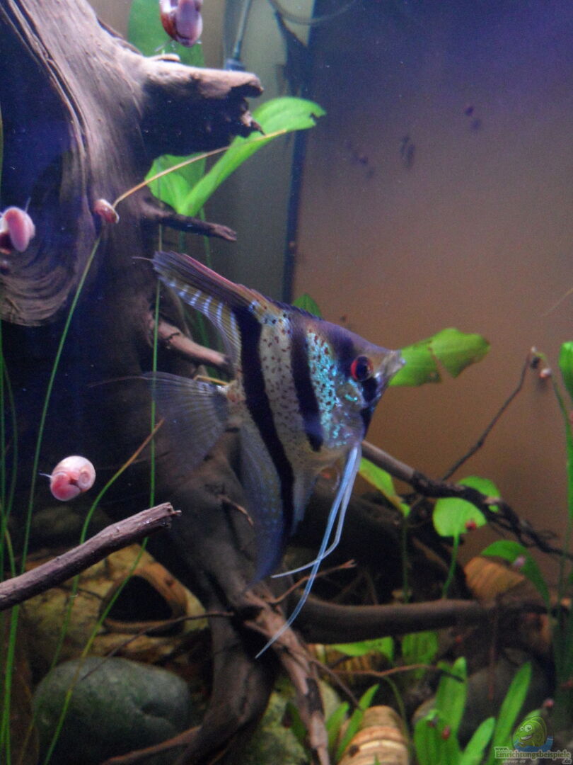 2x Pterophyllum scalare 'Guyana red spotted' 3x L66 8x Hyphessobrychon rosaceus 13x Paracheirodon simulans Geweihschnecken Turmdeckelschnecken Posthornschnecken